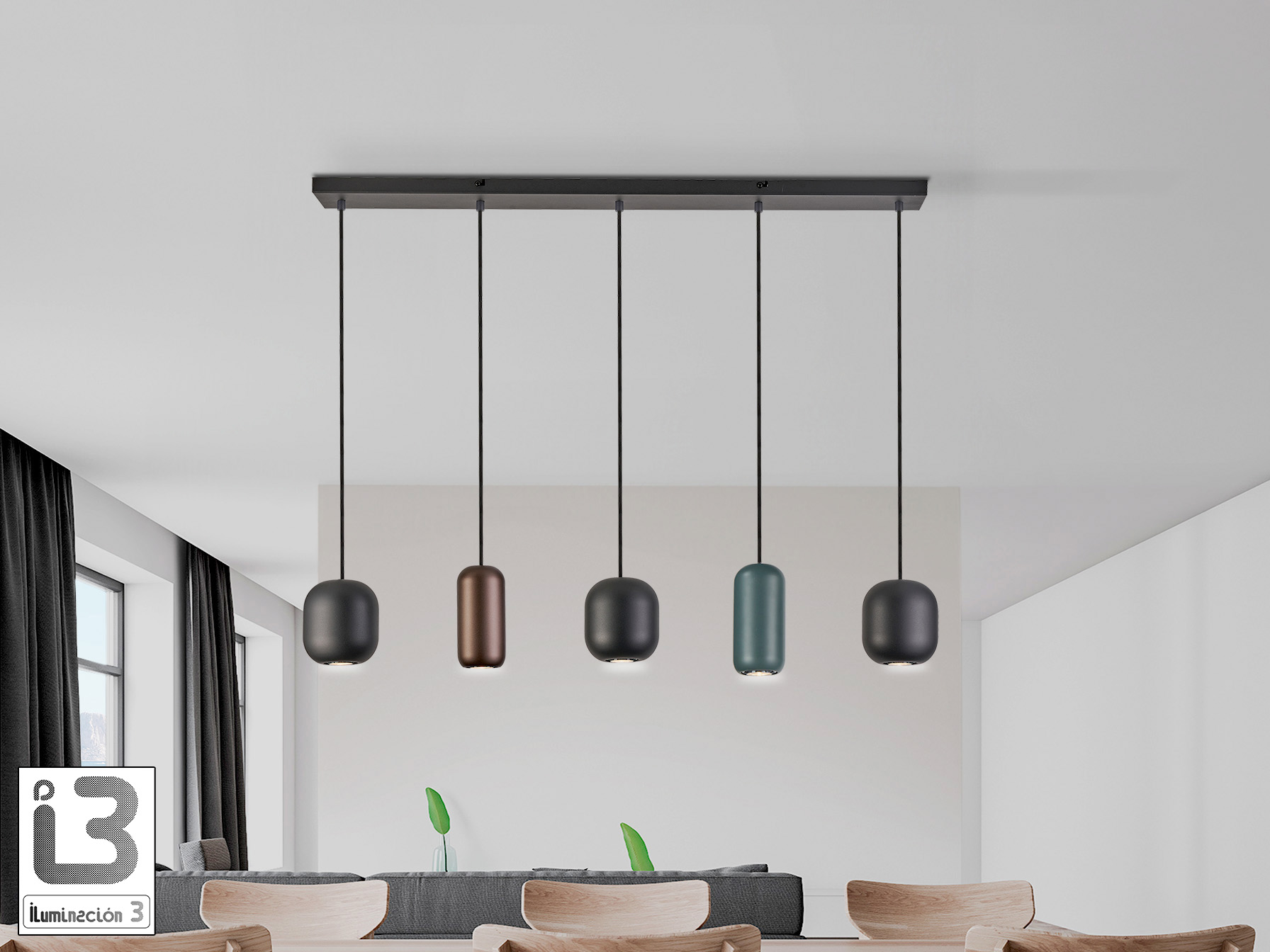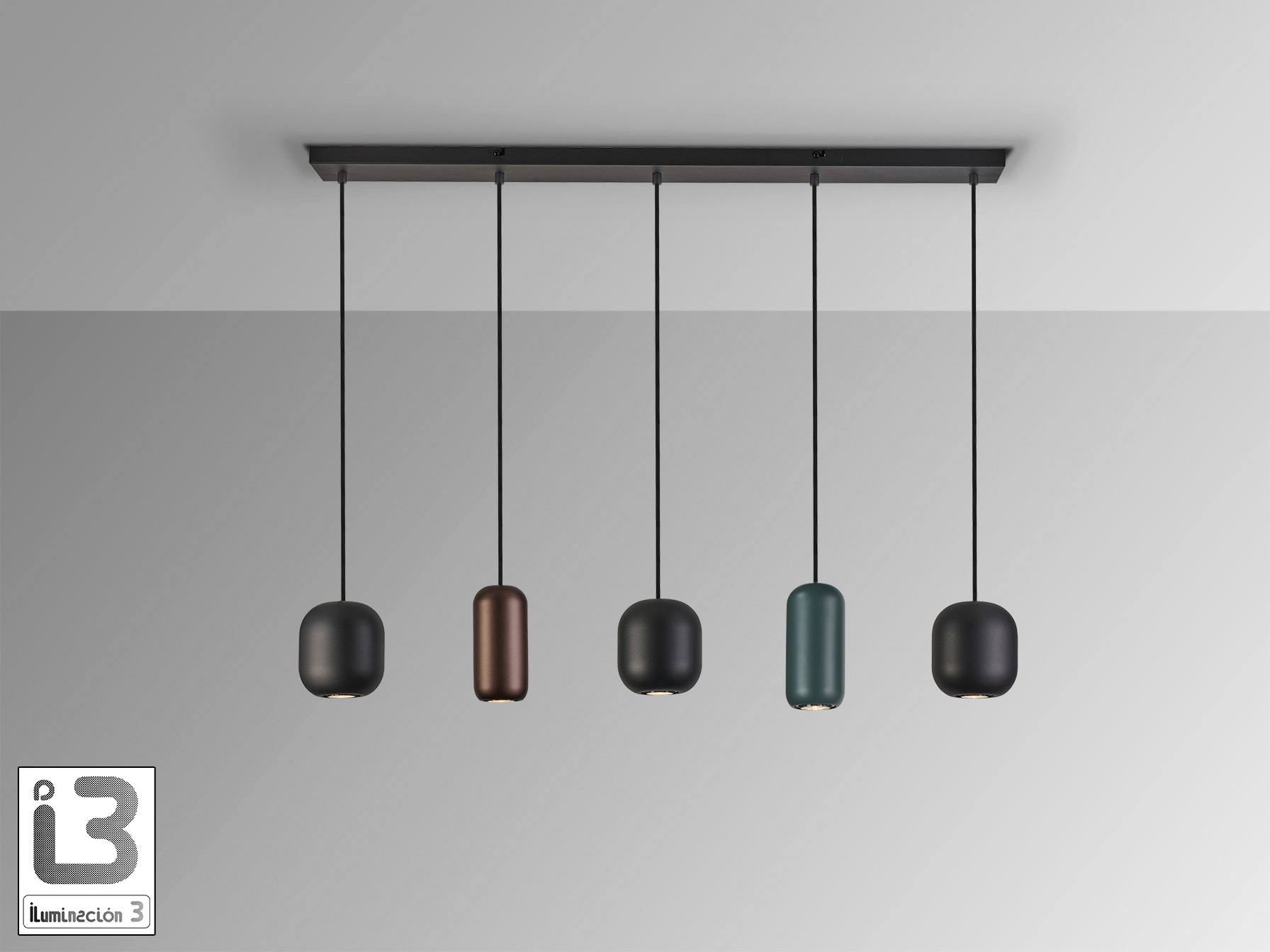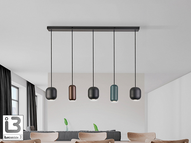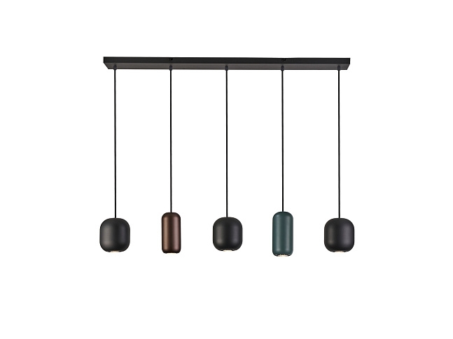 Лампа из металла с матовой чёрной отделкой. 5 металлических плафонов матового чёрного, тёмно-коричневого и тёмно-зелёного цветов. Регулируется по высоте. Цоколь GU10.