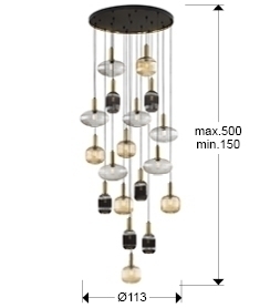Лампа из 18 лампочек из металла черного матового цвета с деталями из сатинированной латуни. Абажуры из формованного стекла с отделкой из прозрачного, янтарного и дымчато-серого мерцающего цвета. Регулируется по длине. Этот товар включает в себя 18 светодиодов E27 мощностью 8 Вт.