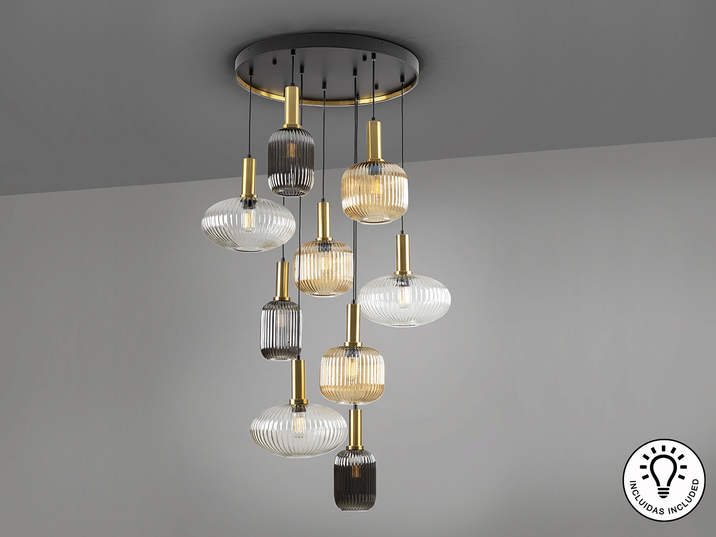 Люстра из 9 лампочек из металла, окрашенного в черный матовый цвет, с деталями из сатинированной латуни. Абажуры из формованного стекла прозрачного, янтарного и мерцающего дымчато-серого цвета. Регулируется по длине.