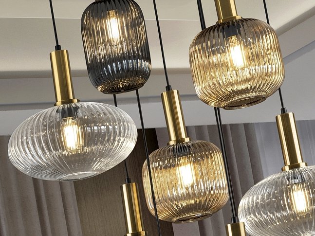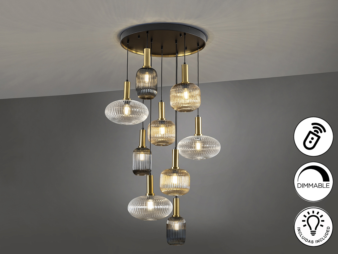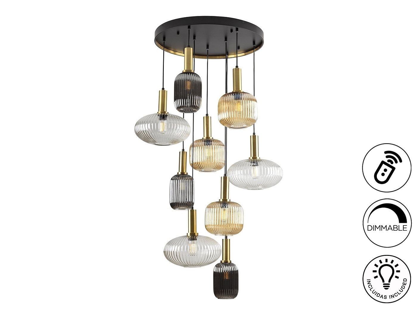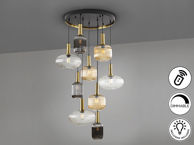 Люстра из 9 лампочек из металла, окрашенного в черный матовый цвет, с деталями из сатинированной латуни. Абажуры из формованного стекла прозрачного, янтарного и мерцающего дымчато-серого цвета. Регулируется по длине. ДИММИМ. Пульт дистанционного управления в комплекте.