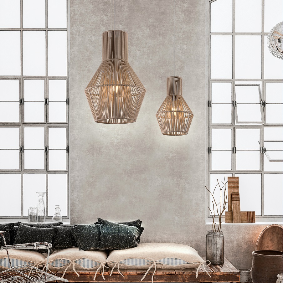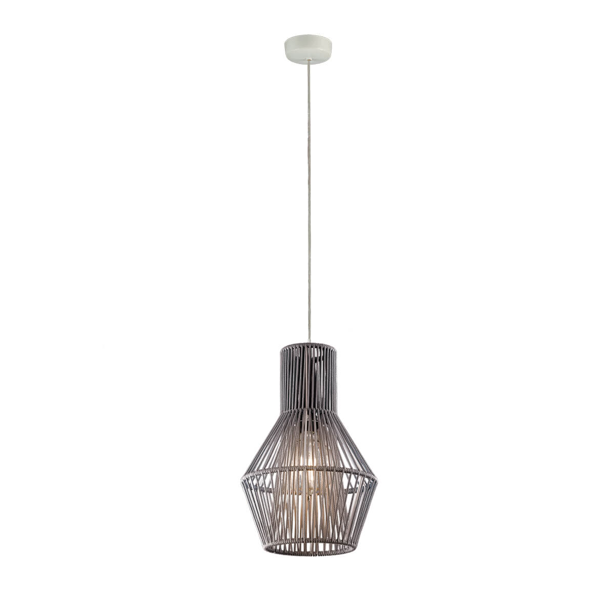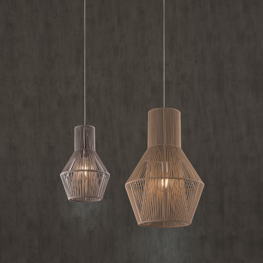 Модель плетеного шнура ручной работы на металлической конструкции, вдохновленная глиняными банками. Свет просеивается через два слоя шнура, освещая любой тип пространства.