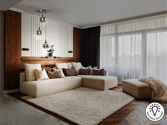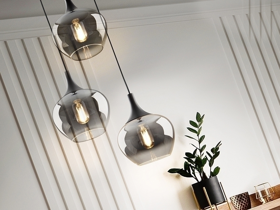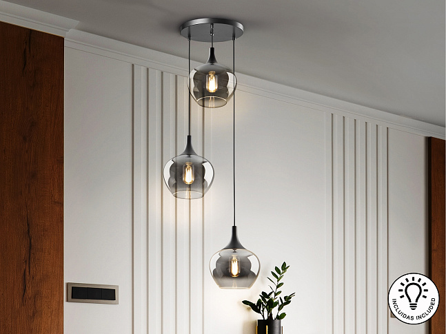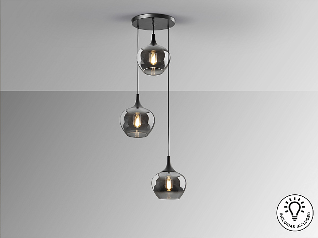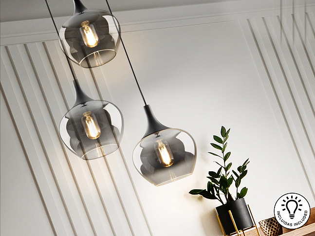 Лампа на 4 лампы, металл, матово-черная отделка. Абажур из деградированного дымчатого стекла диаметром 19 см. Регулируемая высота. ·В комплект поставки входят 4 светодиода E27 мощностью 8 Вт. РЕГУЛИРУЕМАЯ ЯРКОСТЬ. Эта лампа оснащена ГРАВИТАЦИОННЫМИ ПЕРЕКЛЮЧАТЕЛЯМИ для улучшения фиксации на потолке.