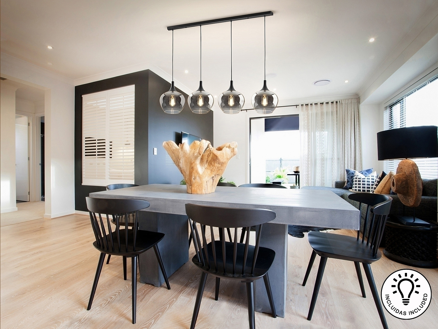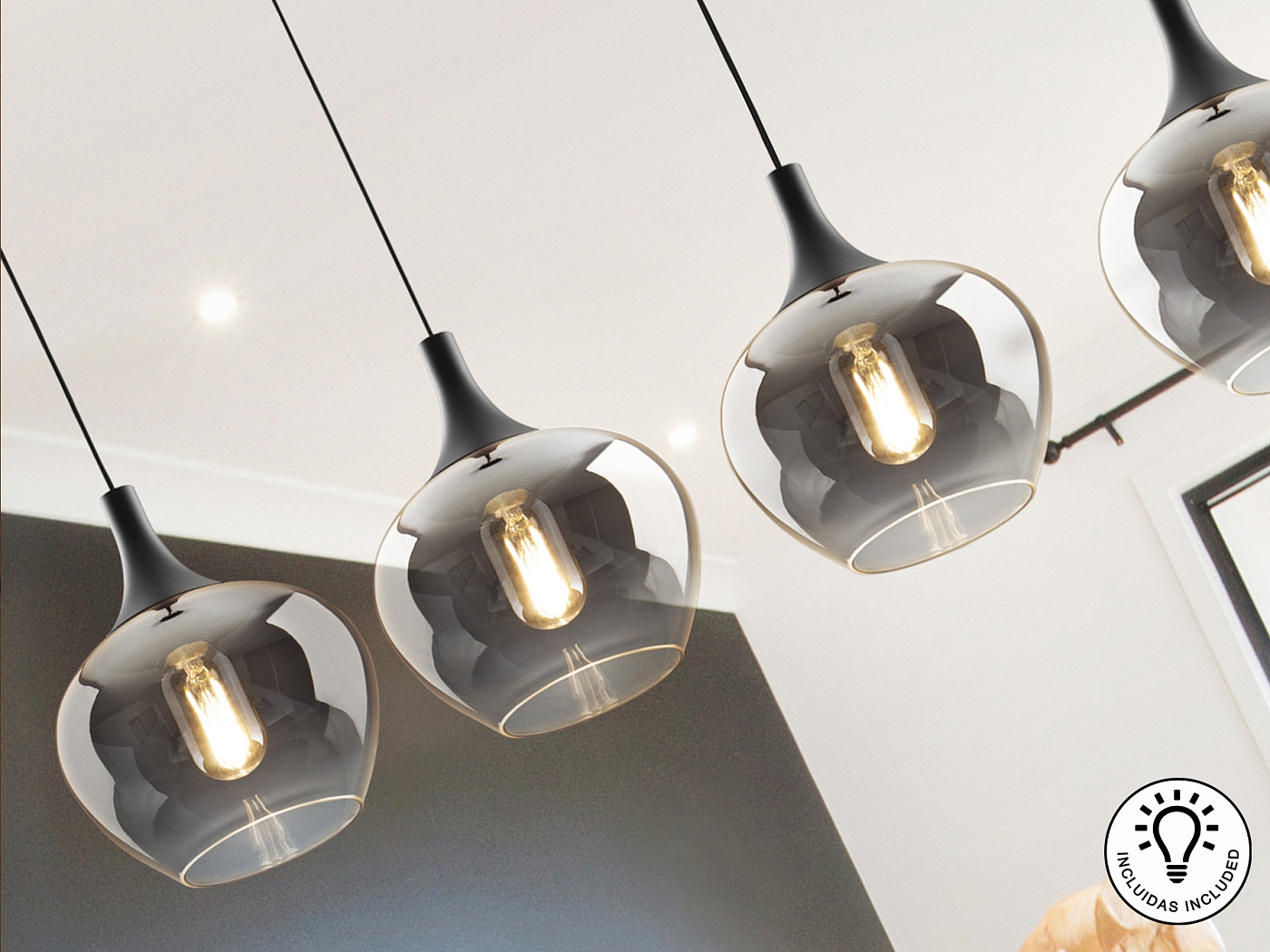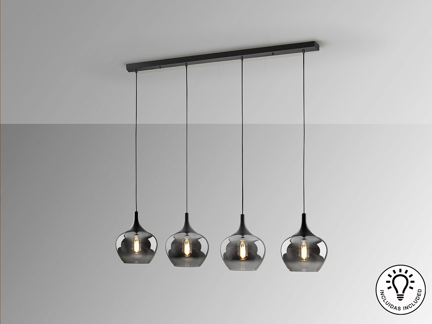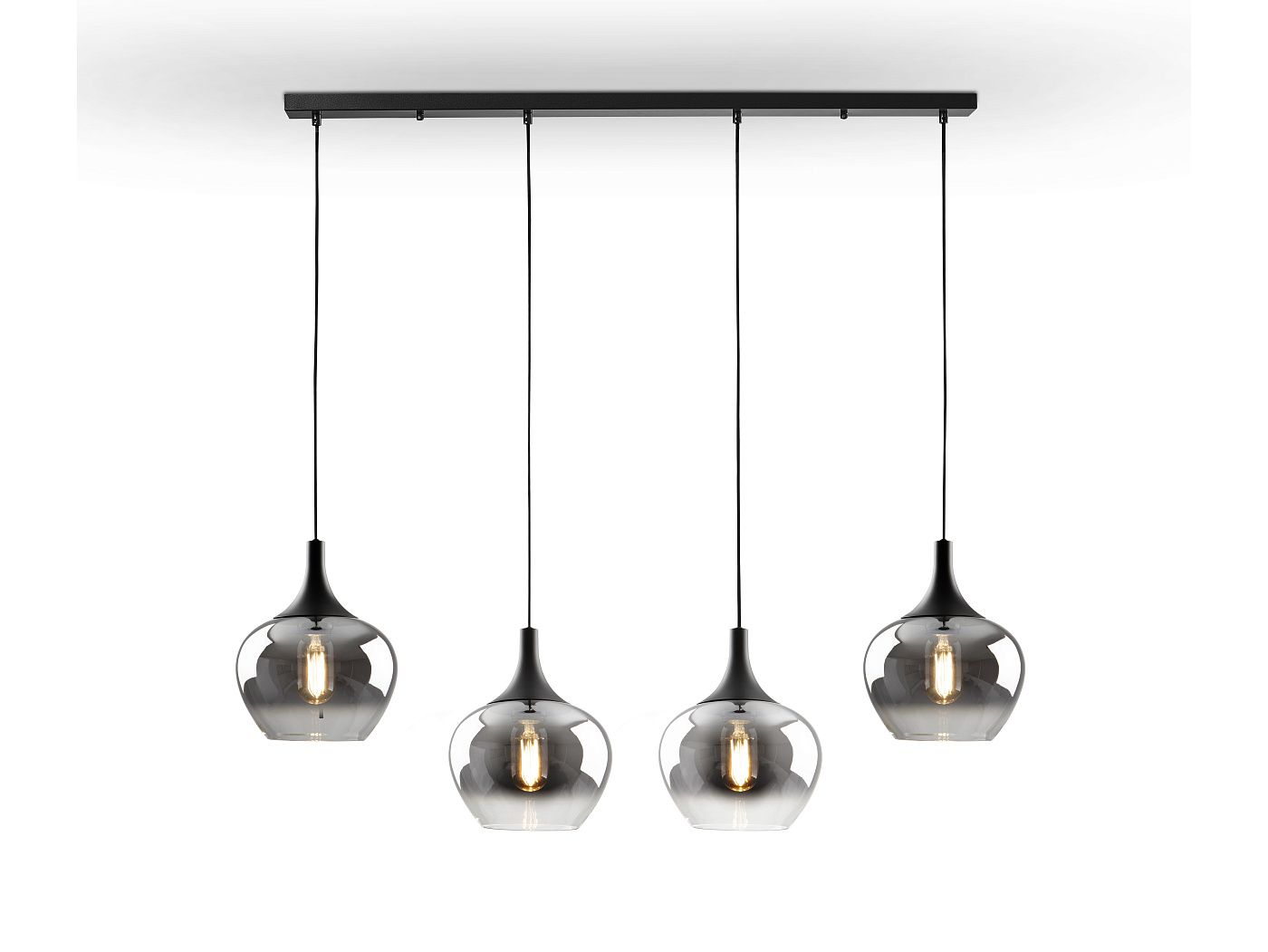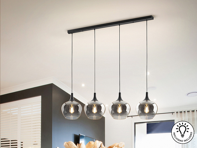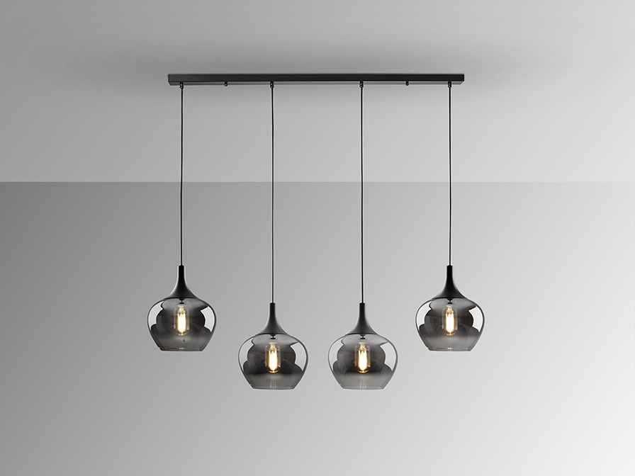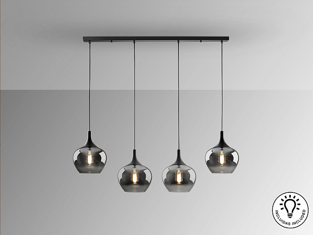 Лампа на 4 лампы, металл, матово-черная отделка. Абажур из деградированного дымчатого стекла диаметром 19 см. Регулируемая высота. ·В комплект поставки входят 4 светодиода E27 мощностью 8 Вт. РЕГУЛИРУЕМАЯ ЯРКОСТЬ. Эта лампа оснащена ГРАВИТАЦИОННЫМИ ПЕРЕКЛЮЧАТЕЛЯМИ для улучшения фиксации на потолке.
