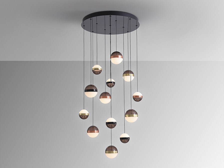 Лампа из 13 светодиодных лампочек, металлическая, черного цвета. Абажуры Ø12 и 15 см из дымчатого поликарбоната и мраморного стекла. Металлические кольца из меди, сатинированной латуни и черного хрома. РЕГУЛИРУЕМАЯ ЯРКОСТЬ. Светодиод 108 Вт. 3000 К. 5030 лм. В комплект входят драйвер TRIAC и НАБОР РЕГУЛИРОВКИ. В этом изделии используется светодиодный драйвер с симистором и регулировкой яркости 0–10 В, в комплект входит набор диммера с диммером и радиочастотным пультом дистанционного управления, или его можно регулировать с помощью симистора или настенного диммера 0–10 В. · Эта лампа поставляется с ГРАВИТАЦИОННЫМИ ПЕРЕКЛЮЧАТЕЛЯМИ для улучшения крепления к потолку.