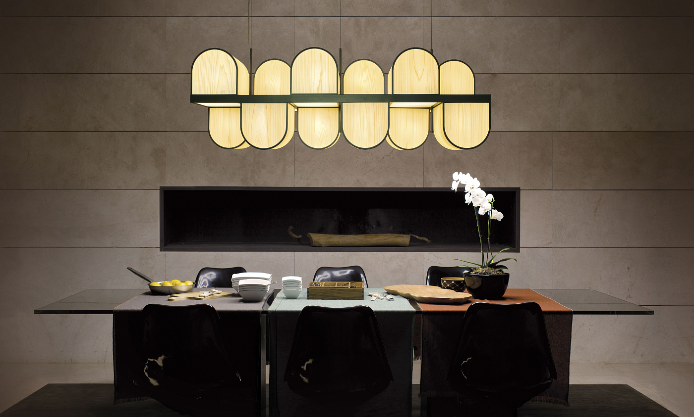 OSCA — это светильник, вдохновленный архитектурой и эстетикой кубизма. В подвесном светильнике Osca простые, переплетающиеся трехмерные арки из деревянного шпона обращены как вверх, так и вниз, придавая светильнику уникальную скульптурную форму. Созданный Бодо Сперлейном, Osca представляет собой минималистичный коллаж из фигур. Семейство Osca состоит из двух подвесных версий и одной настольной лампы.
