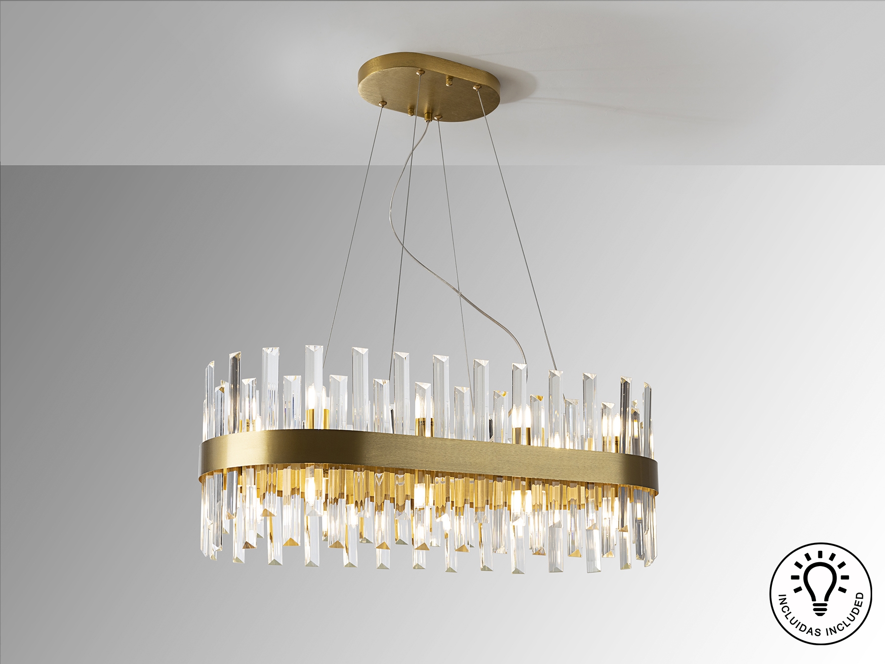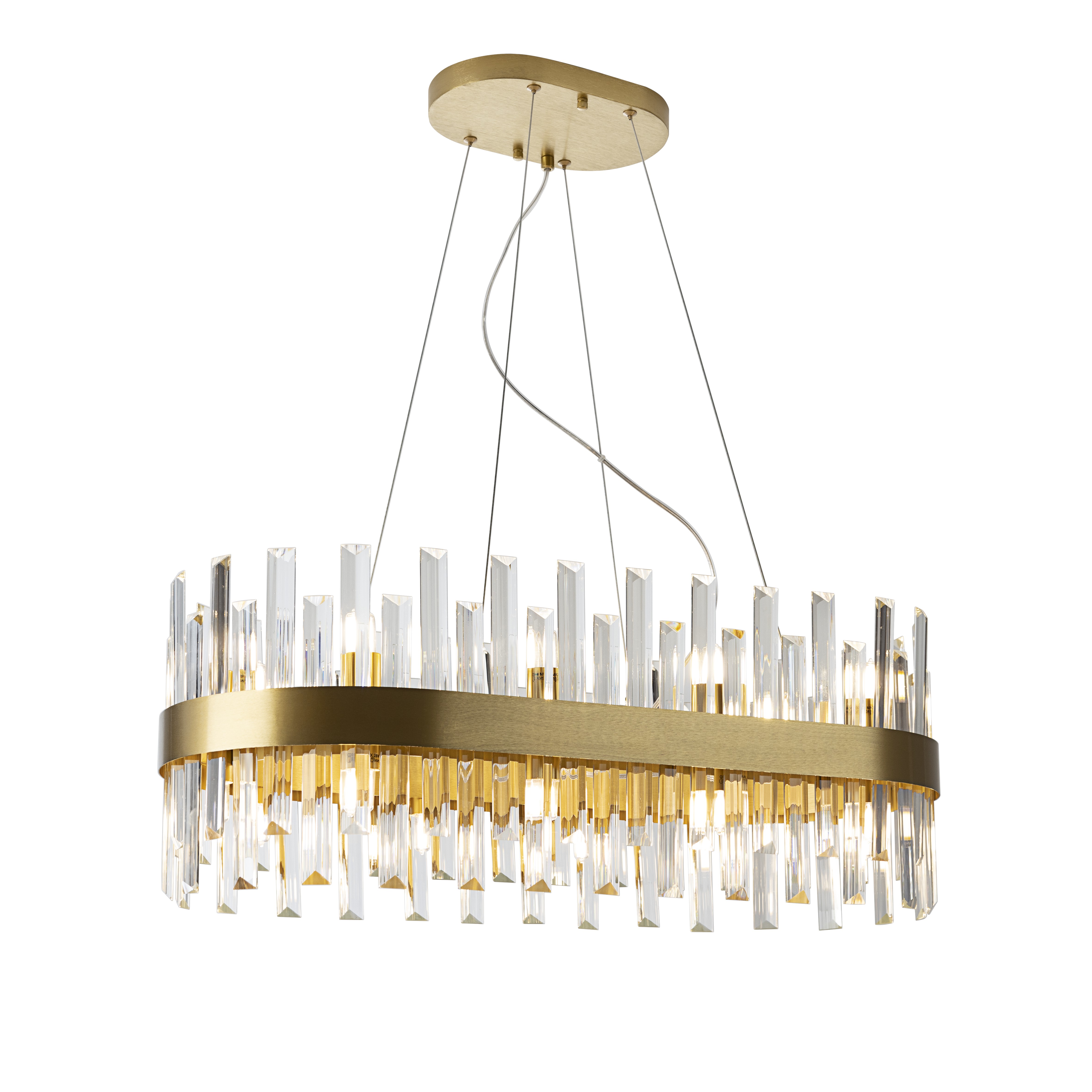 Овальный светильник на 20 лампочек из матового металла с позолотой. Рассеиватель из прозрачного стекла призматической формы. ·Этот товар включает в себя 20 светодиодов G9 мощностью 4 Вт.