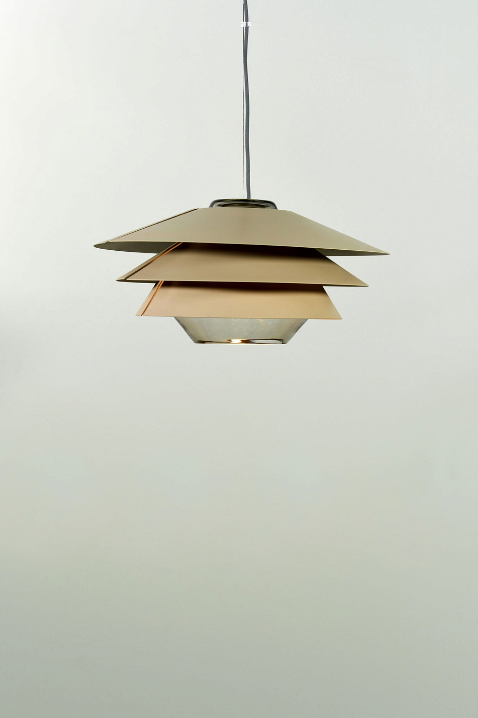 Подвесной светильник из дутого стекла, оснащенный тремя съемными коническими отражателями, которые позволяют варьировать световой эффект в соответствии с потребностями пользователя. Стекло коньячного цвета сочетается с отражателями матового бежевого, медного, серо-бежевого и желтого цветов. Стекло с серой отделкой продается с отражателями бежевого, темно-синего и голубого цвета, все они матовые. Серый текстильный кабель. Доступен в трех размерах.