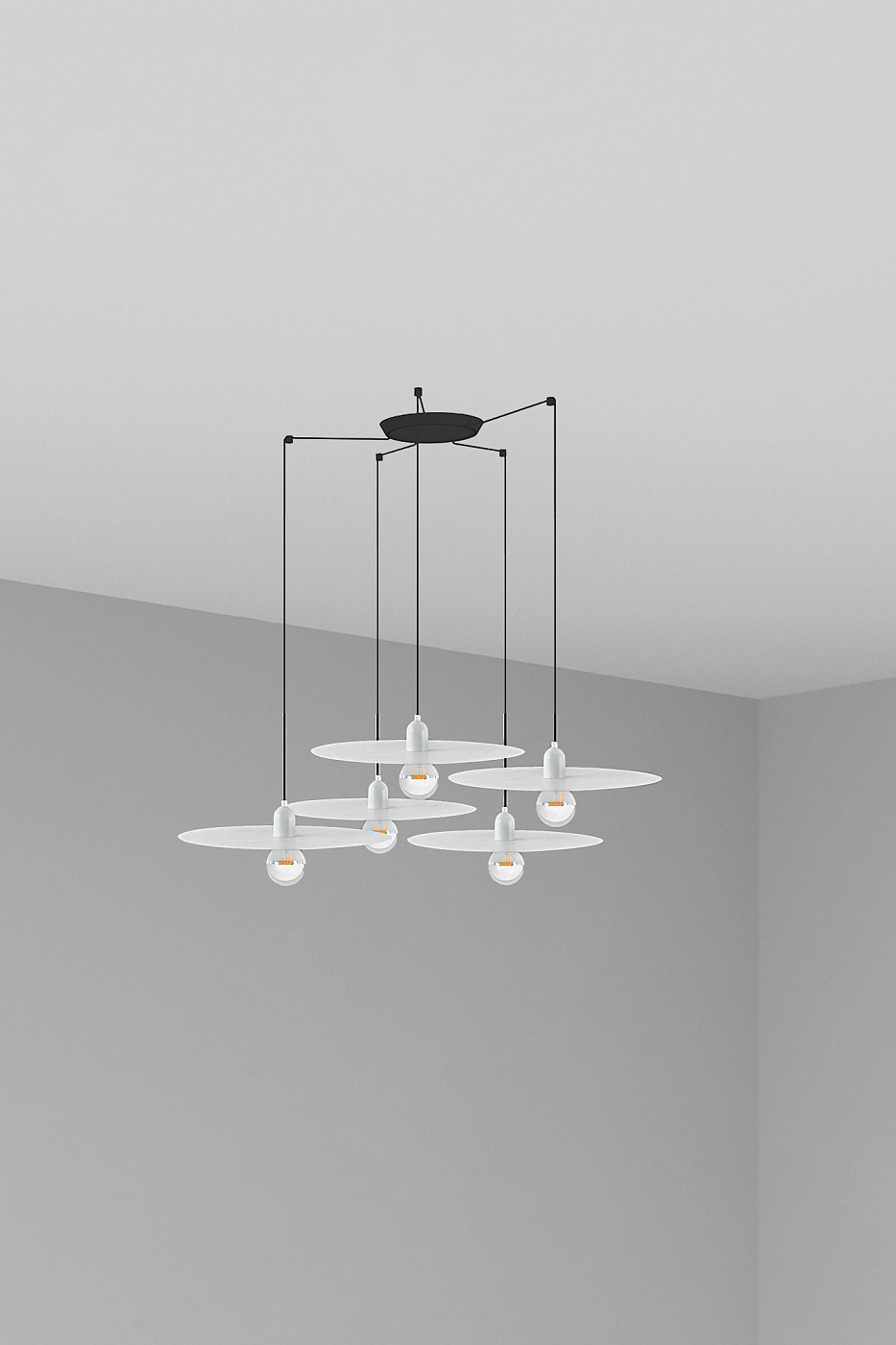 PLAT - белый подвесной светильник в стиле минимализма. В центре внимания находится лампочка, изображенная во всей красе. Доступен в двух цветах, идеально соответствующих скандинавскому стилю. Версия с 5-лучевой розеткой.