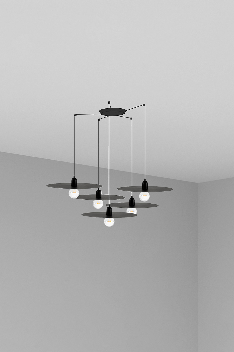 PLAT - черный подвесной светильник в стиле минимализма. В центре внимания находится лампочка, изображенная во всей красе. Доступен в двух цветах, идеально соответствующих скандинавскому стилю. Версия с 5-лучевой розеткой.
