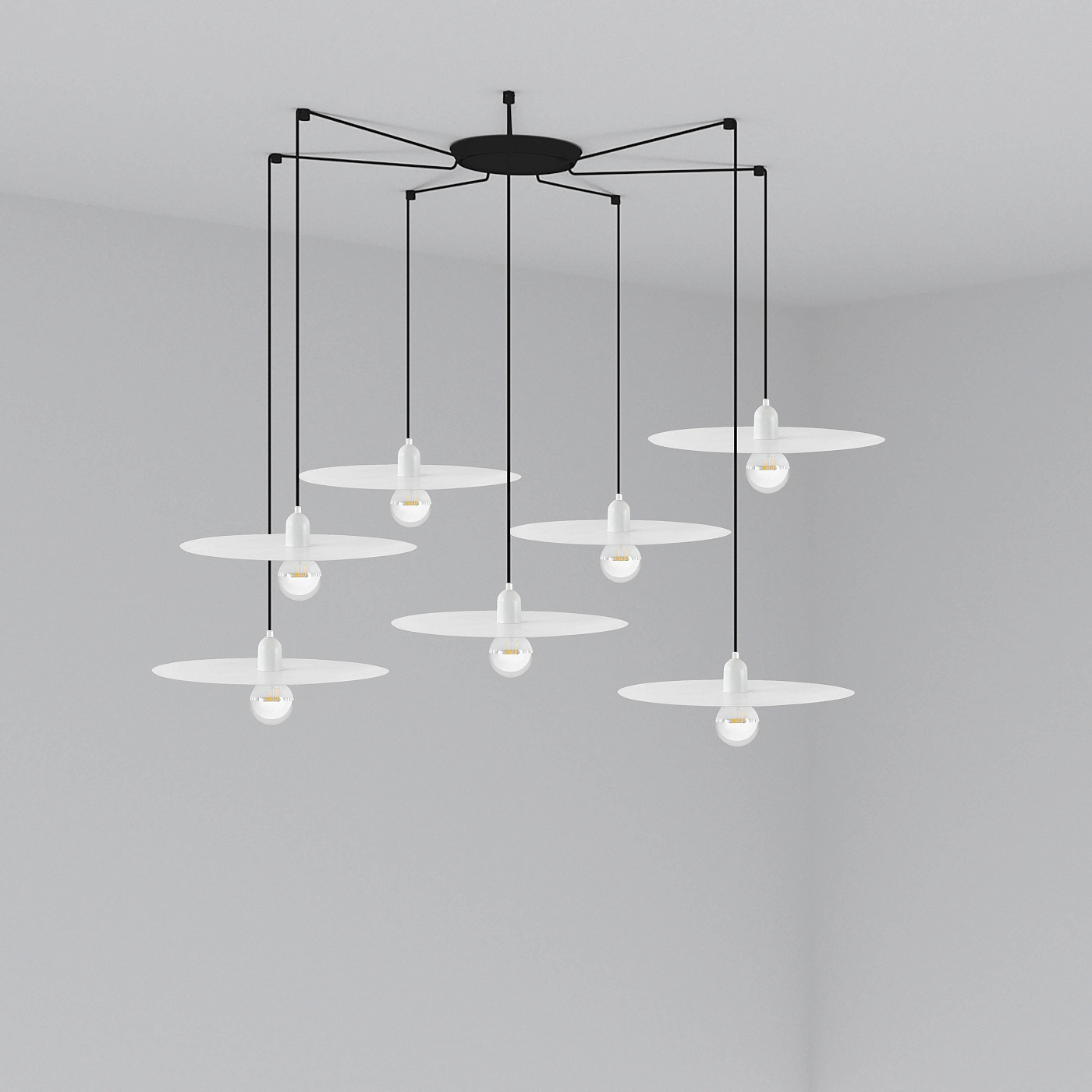 PLAT - белый подвесной светильник в стиле минимализма. В центре внимания находится лампочка, изображенная во всей красе. Доступен в двух цветах, идеально соответствующих скандинавскому стилю. Версия с несколькими потолочными розетками с 7 лампами.