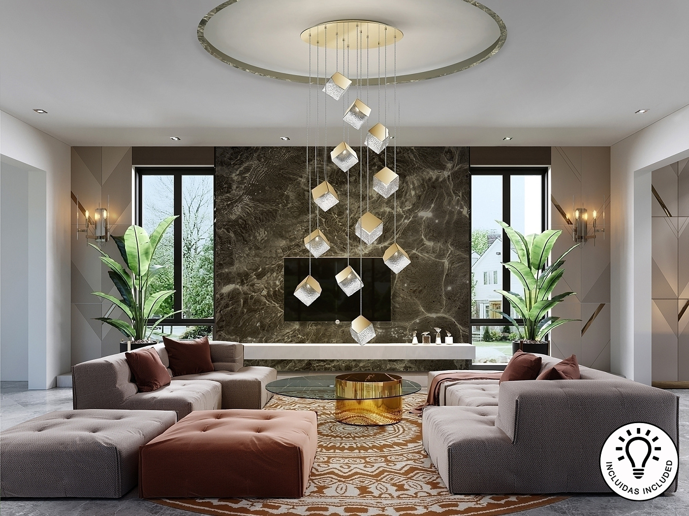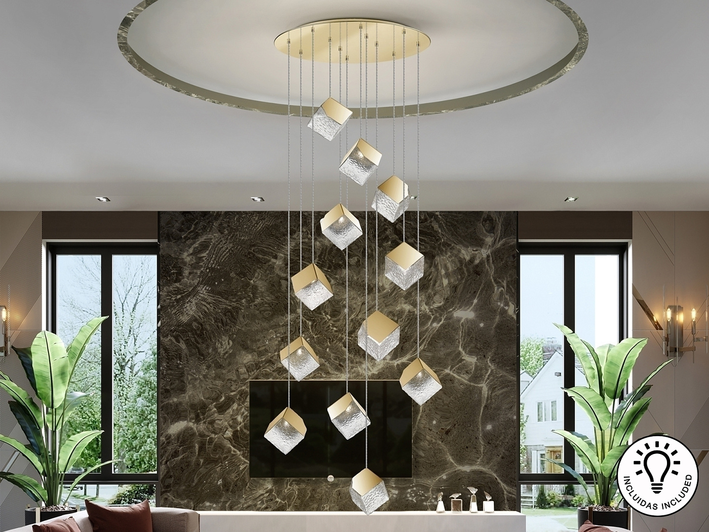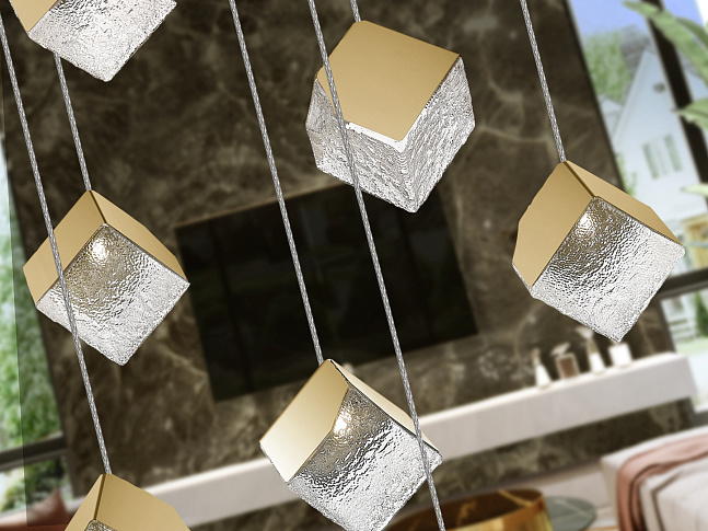 Круглая люстра из 12 лампочек из металла и стали, отделанная золотом. Кубический абажур из фактурного стекла. Регулируется по высоте. ·Этот товар включает 12 светодиодов G9 мощностью 6 Вт.