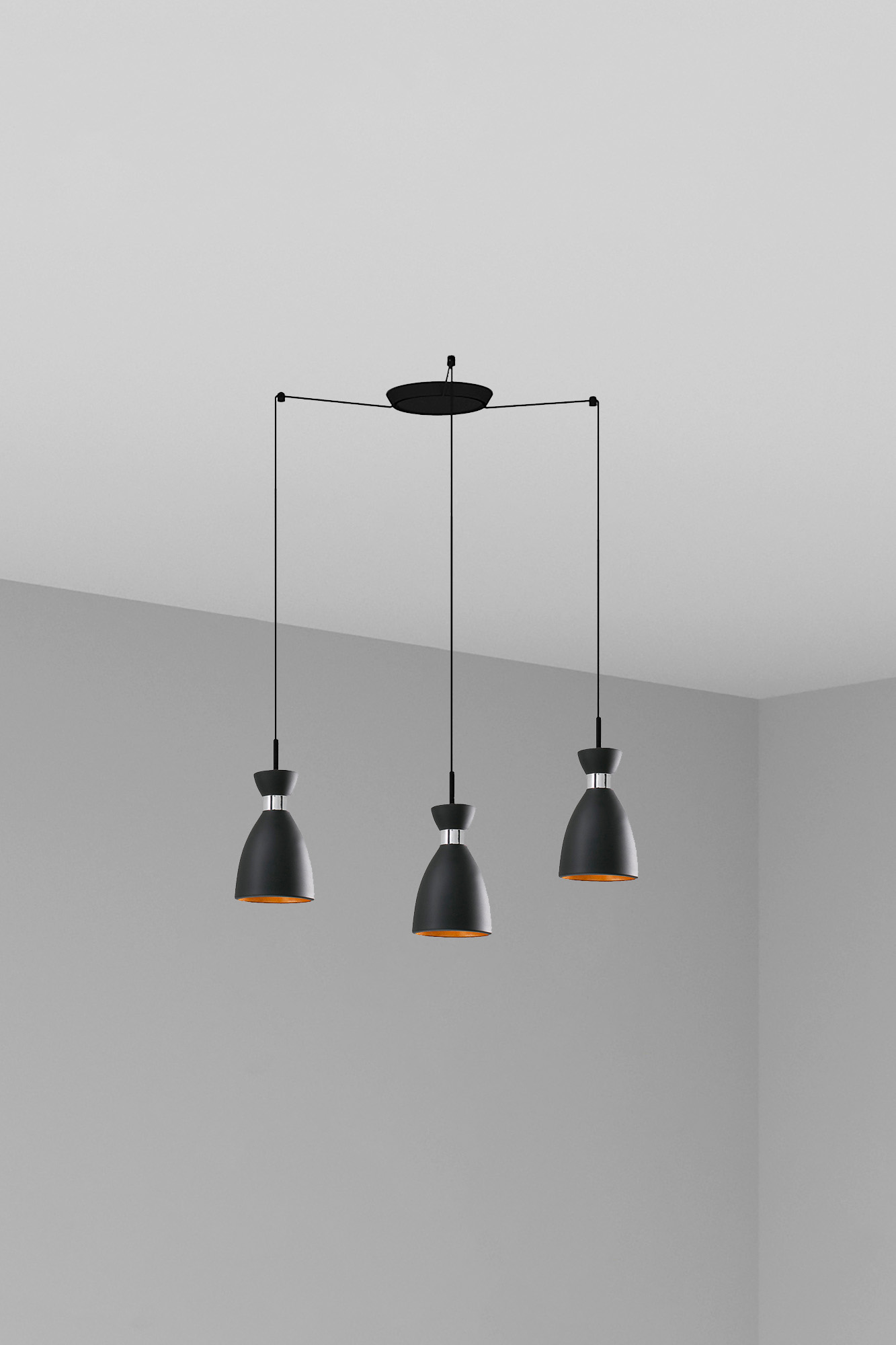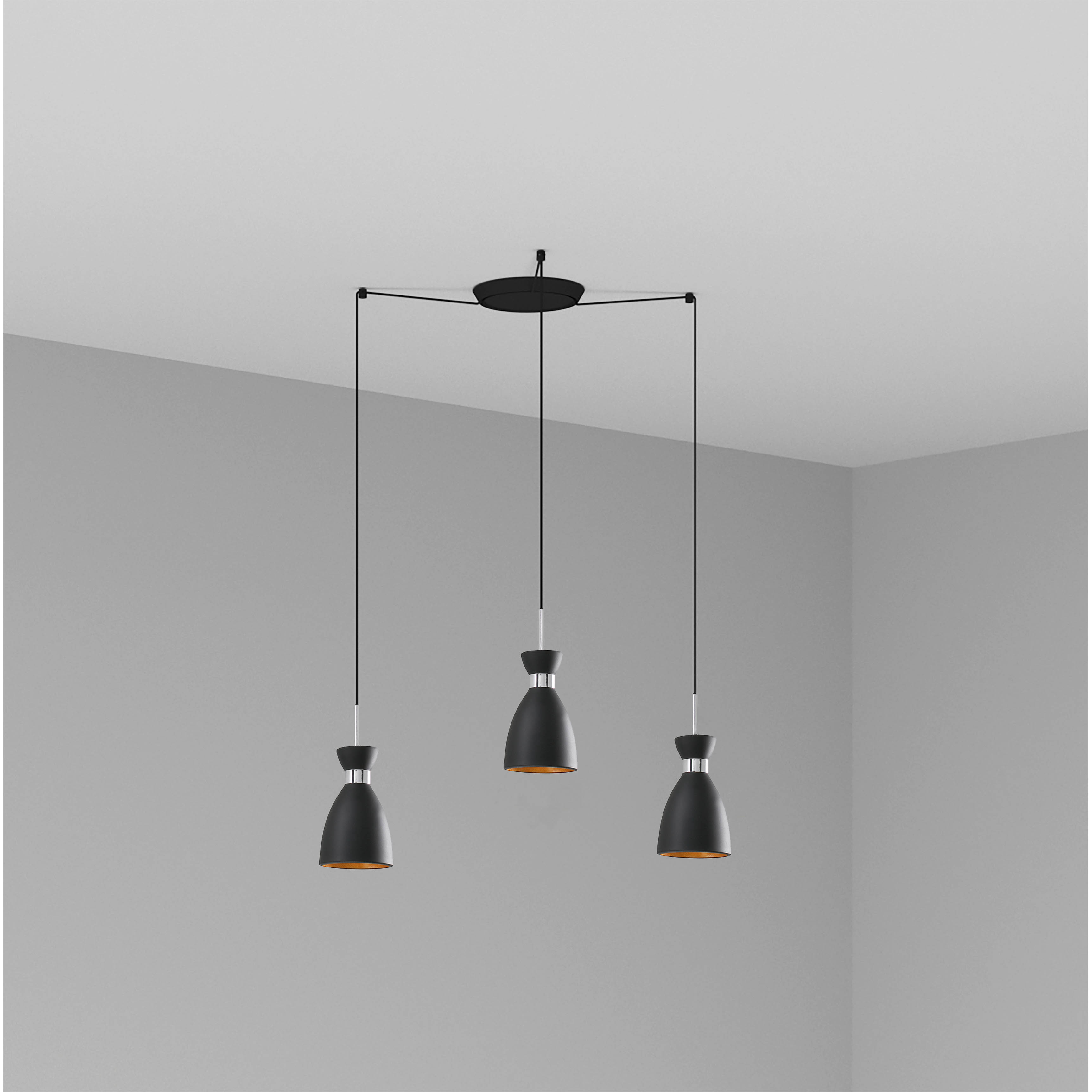 RETRO - это серия дизайнерских ламп от Alex & Manel Lluscà, вдохновленная 60-ми годами. С помощью этого черно-медного подвесного светильника вы можете осветить различные помещения в вашем доме. С этой серией вы получите ретро-атмосферу для домашнего освещения. Версия с несколькими потолочными розетками с 3 лампами.