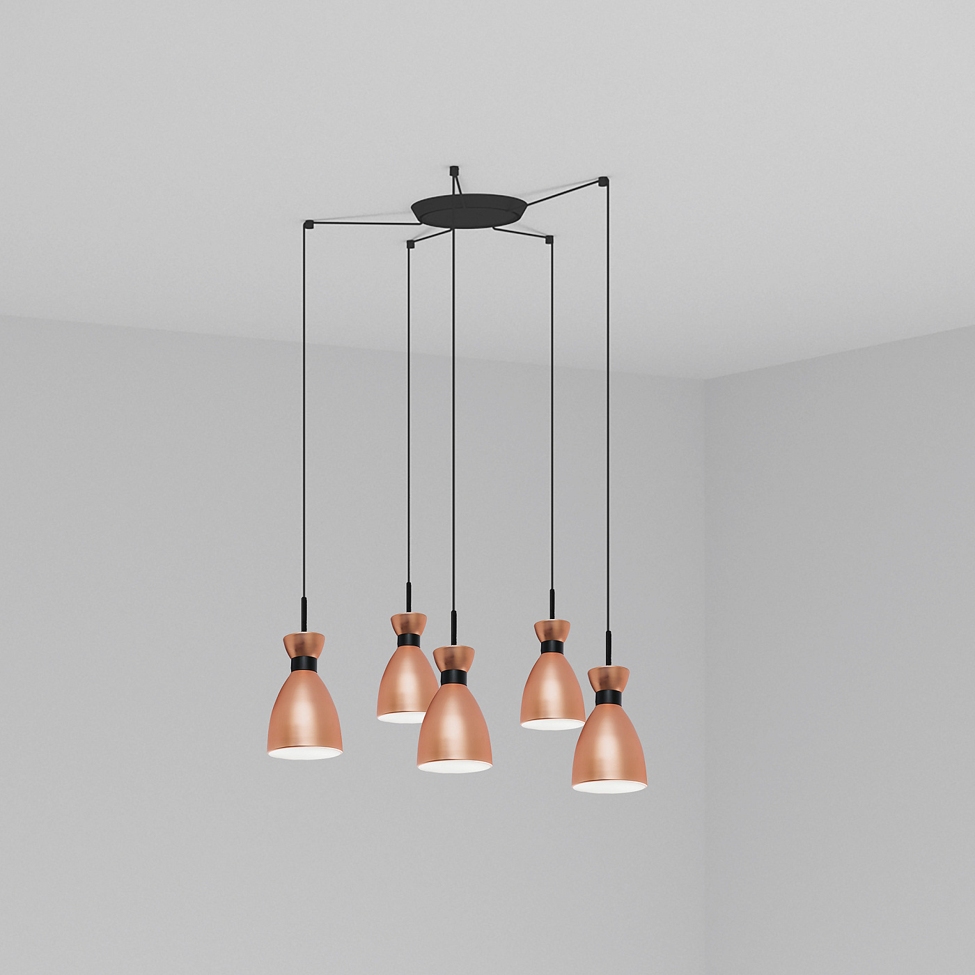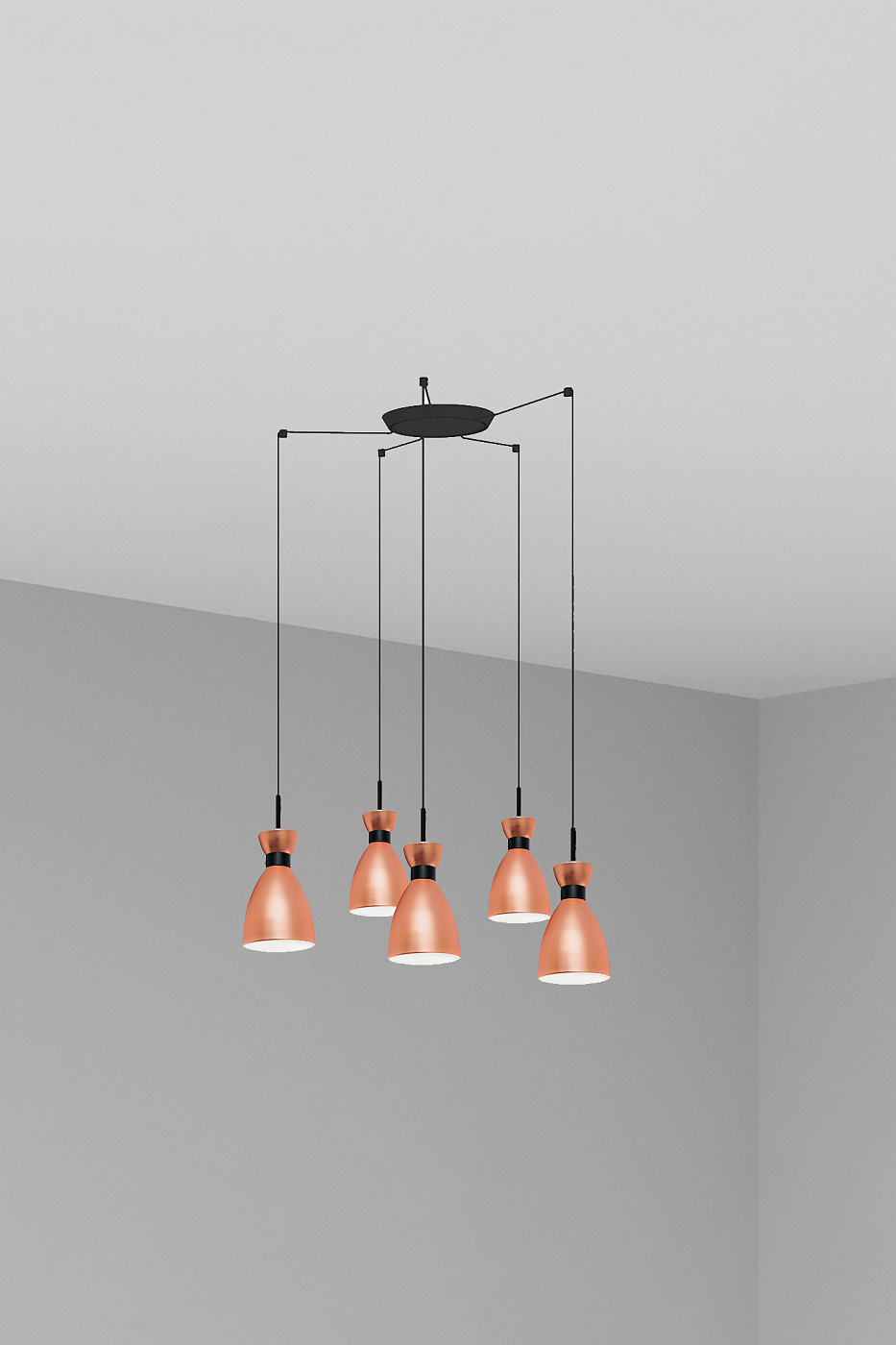 RETRO - это серия дизайнерских ламп от Alex & Manel Lluscà, вдохновленная 60-ми годами. С помощью этого подвесного светильника из меди вы можете осветить различные помещения в вашем доме. С этой серией вы получите ретро-атмосферу для домашнего освещения. Версия с 5-лучевой розеткой.