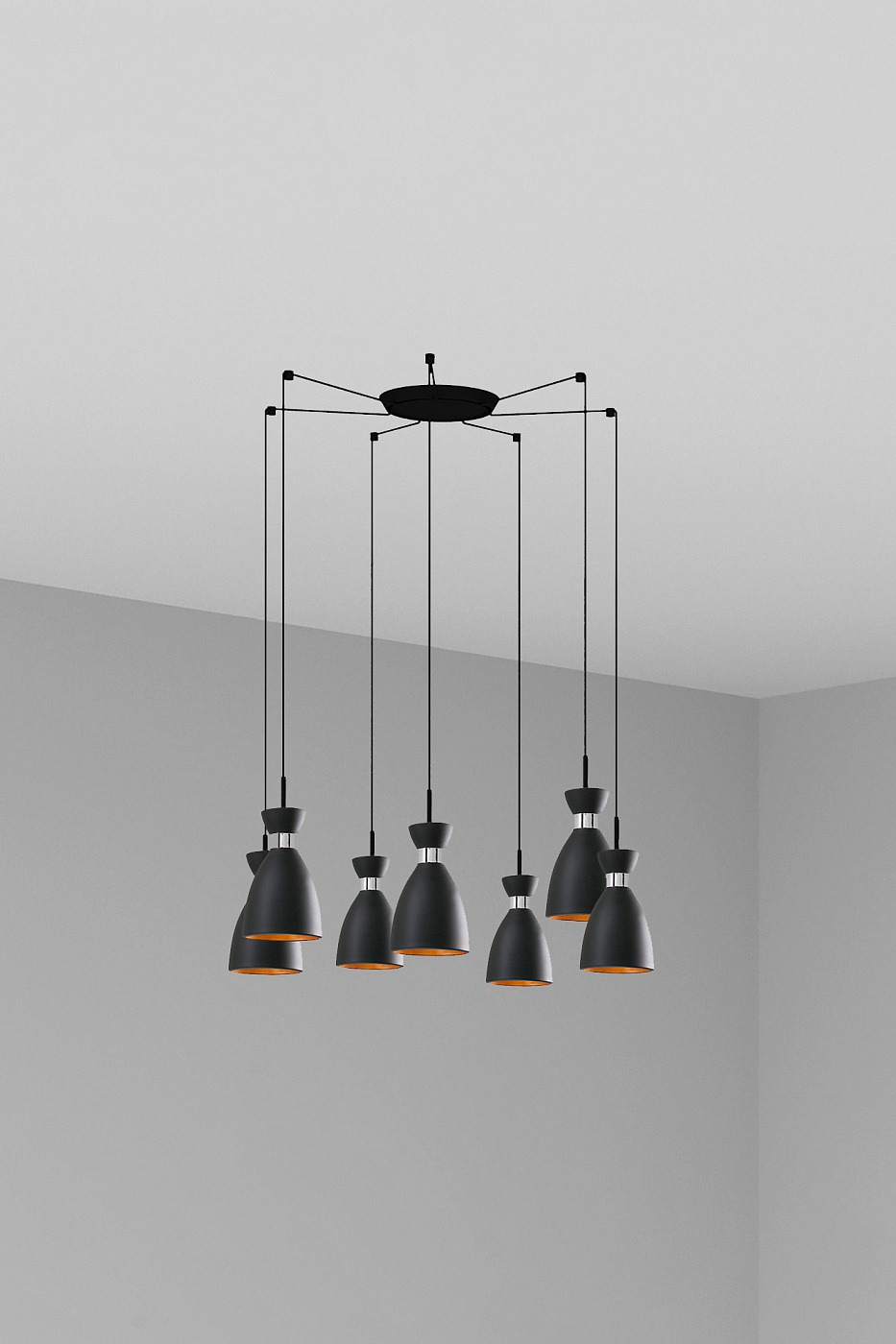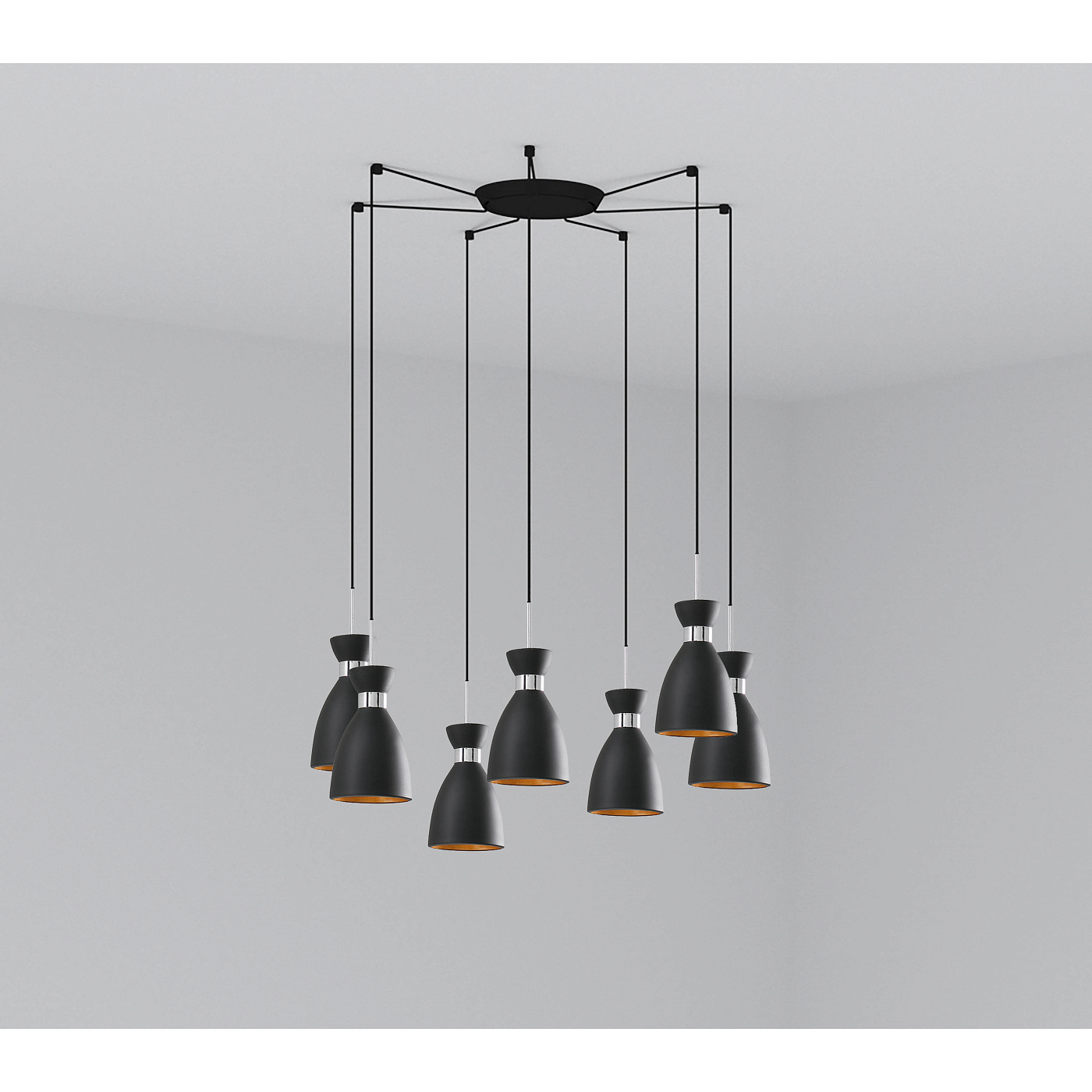 RETRO - это серия дизайнерских ламп от Alex & Manel Lluscà, вдохновленная 60-ми годами. С помощью этого черно-медного подвесного светильника вы можете осветить различные помещения в вашем доме. С этой серией вы получите ретро-атмосферу для домашнего освещения. Версия с несколькими потолочными розетками с 7 лампами.