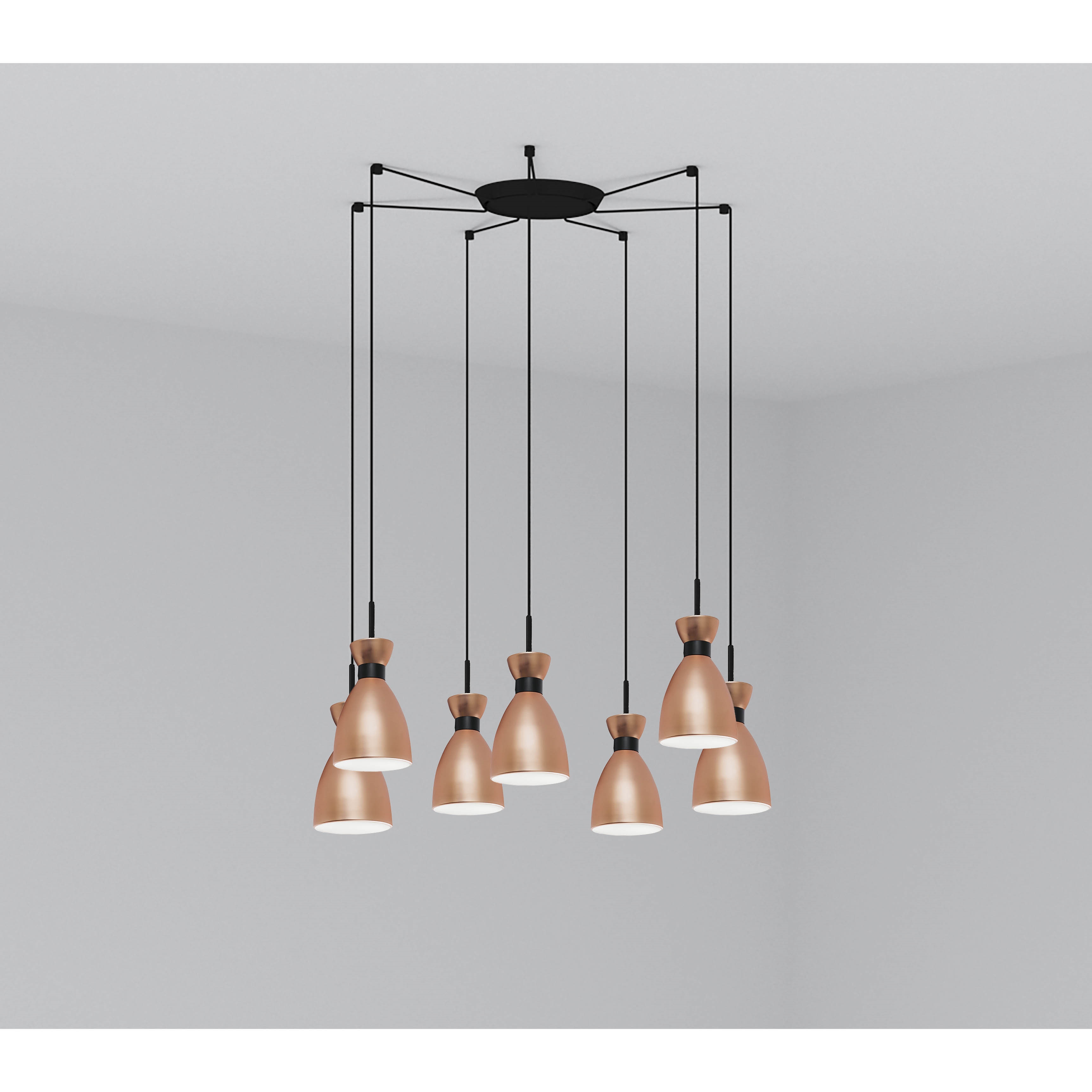 RETRO - это серия дизайнерских ламп от Alex & Manel Lluscà, вдохновленная 60-ми годами. С помощью этого подвесного светильника из меди вы можете осветить различные помещения в вашем доме. С этой серией вы получите ретро-атмосферу для домашнего освещения. Версия с несколькими потолочными розетками с 7 лампами.