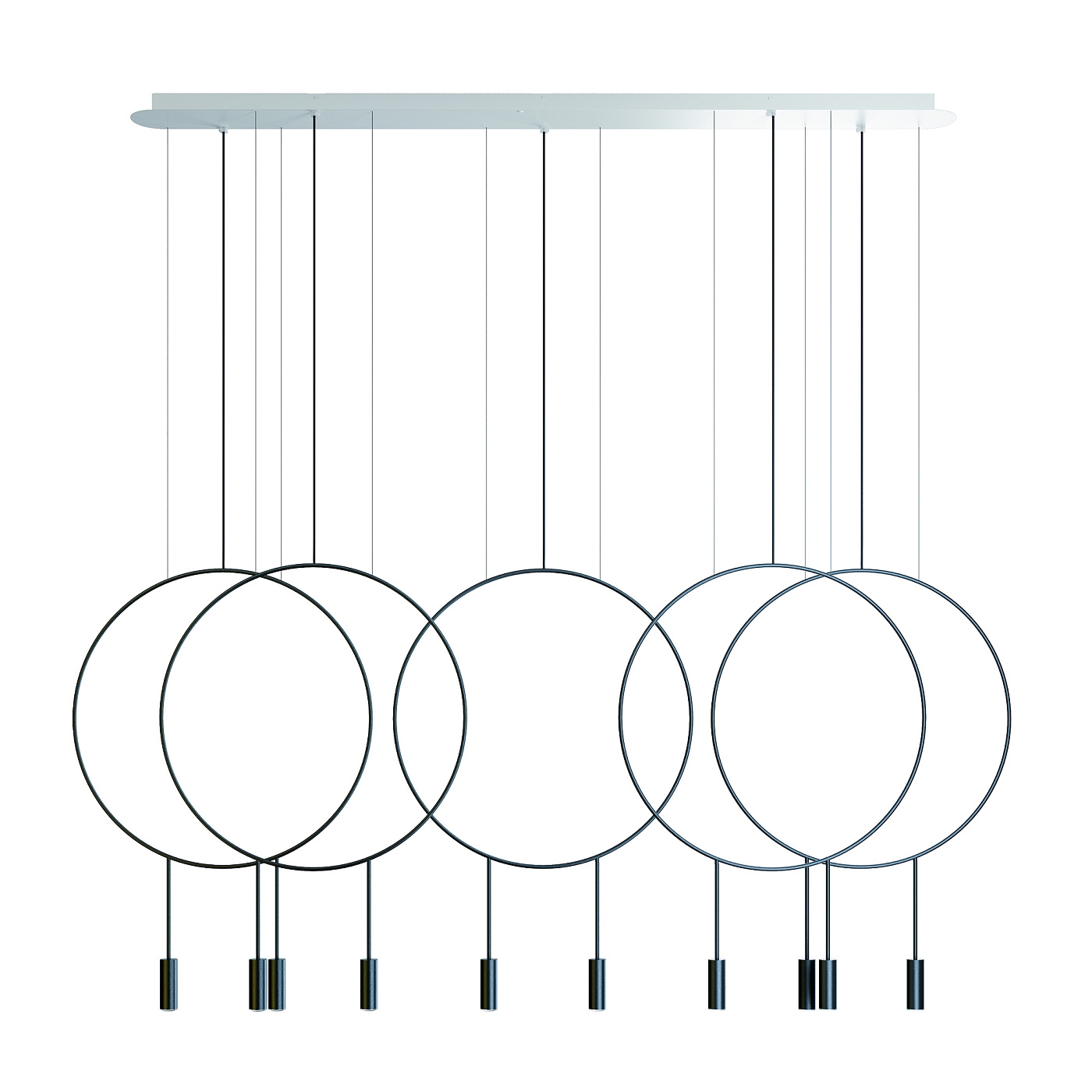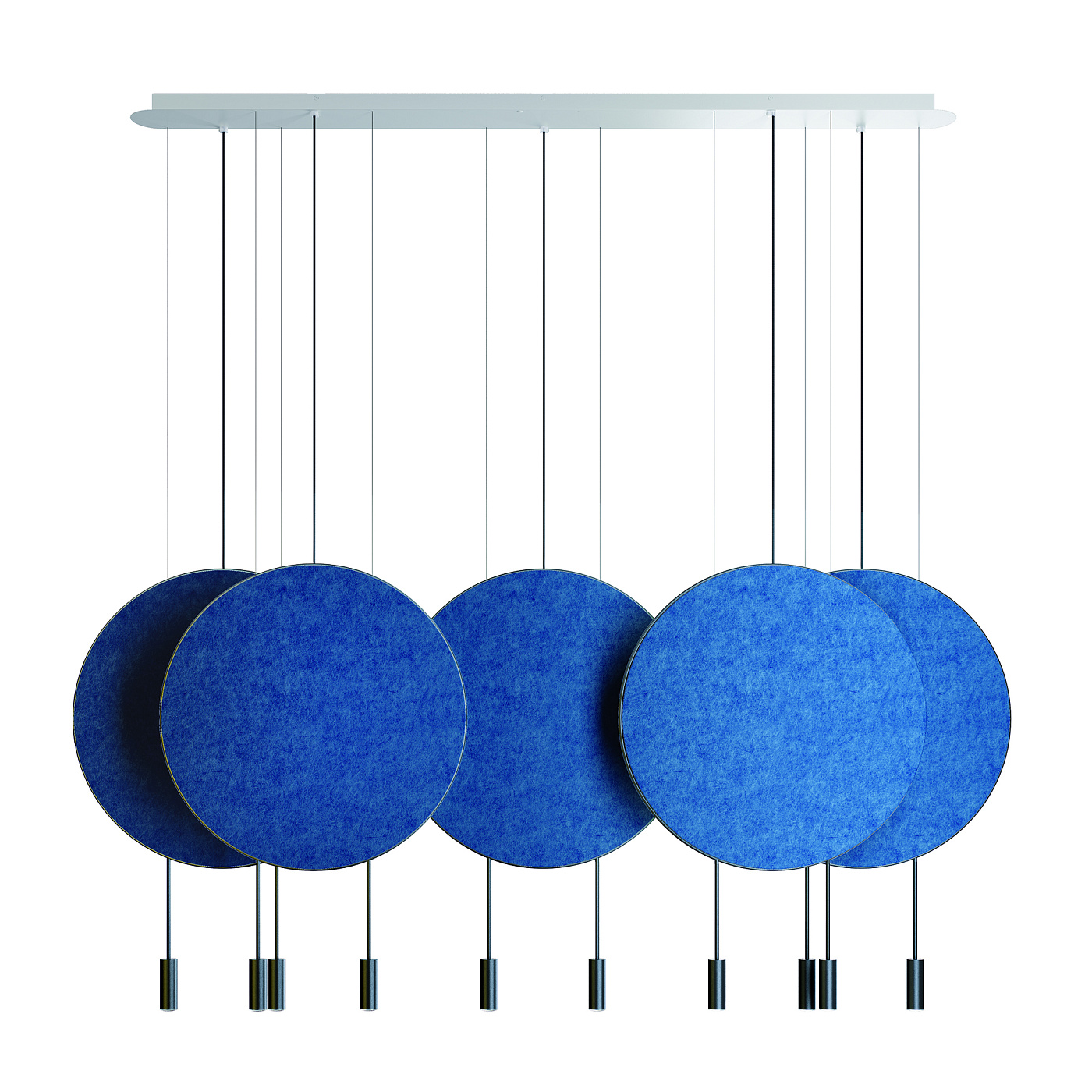 Стильный подвесной светильник с круглым корпусом, цилиндрическими алюминевыми плафонами с акриловыми оптическими линзами. Регулируемая высота. Дополнительный комплект для поворота акриловых оптических линз под углом 50º и декоративная звукопоглощающая панель.