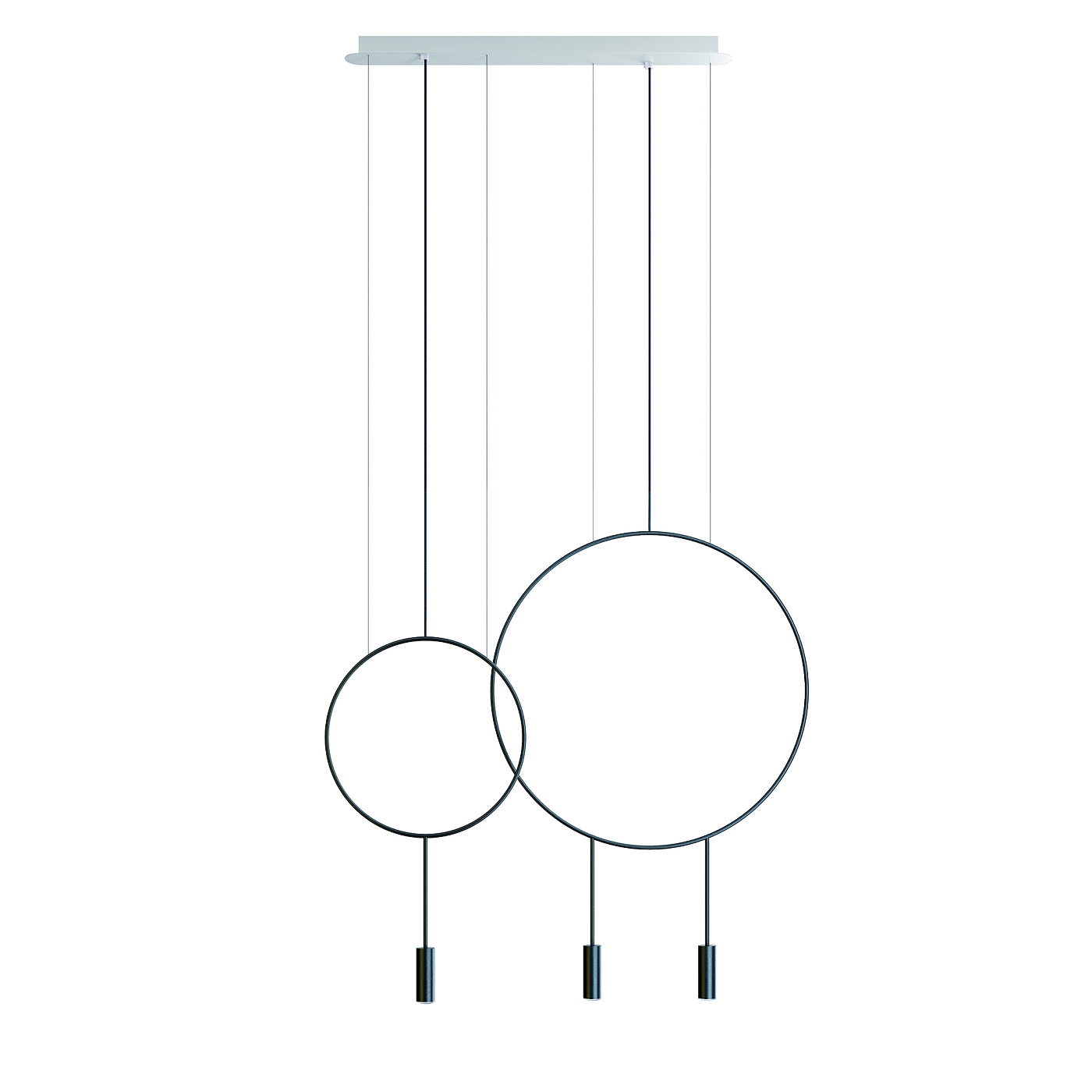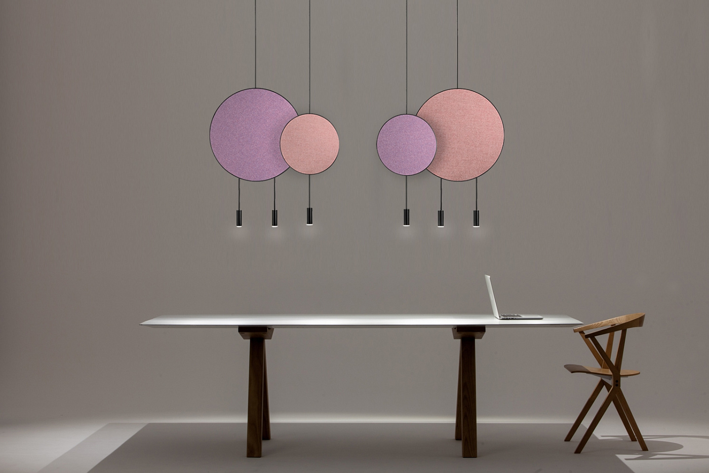 Стильный подвесной светильник с круглым корпусом, цилиндрическими алюминевыми плафонами с акриловыми оптическими линзами. Регулируемая высота. Дополнительный комплект для поворота акриловых оптических линз под углом 50º и декоративная звукопоглощающая панель.