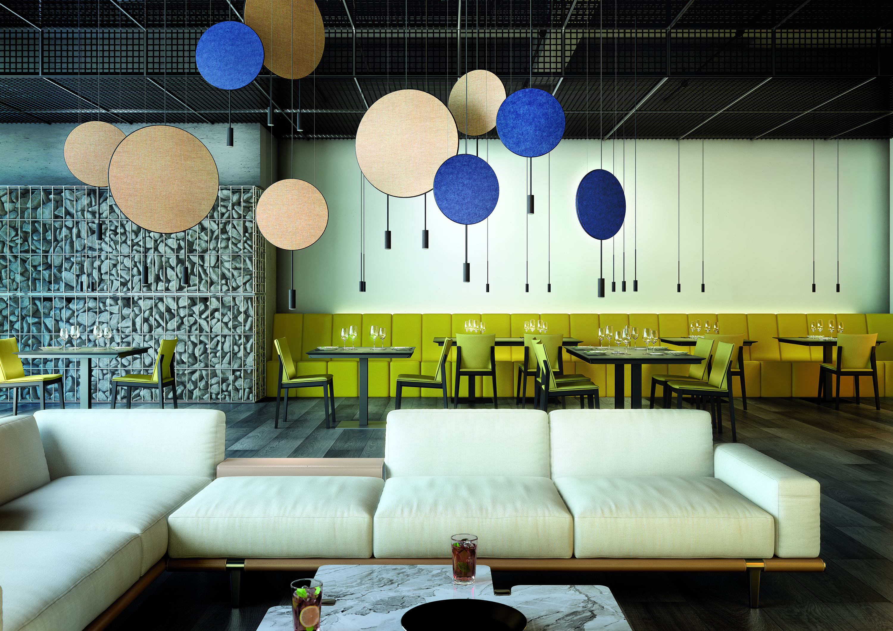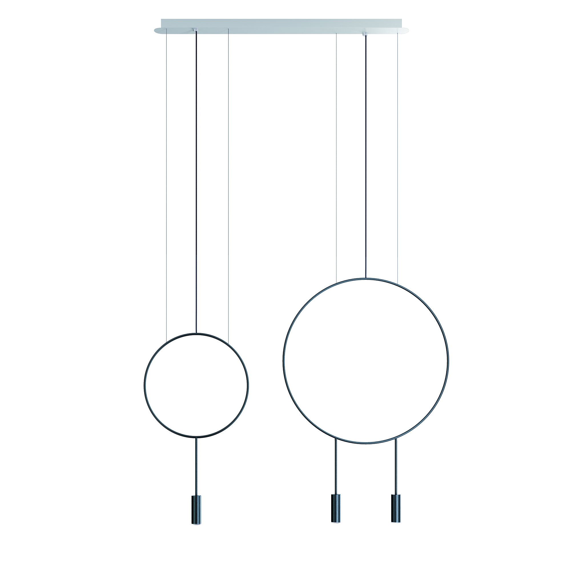 Стильный подвесной светильник с круглым корпусом, цилиндрическими алюминевыми плафонами с акриловыми оптическими линзами. Регулируемая высота. Дополнительный комплект для поворота акриловых оптических линз под углом 50º и декоративная звукопоглощающая панель.