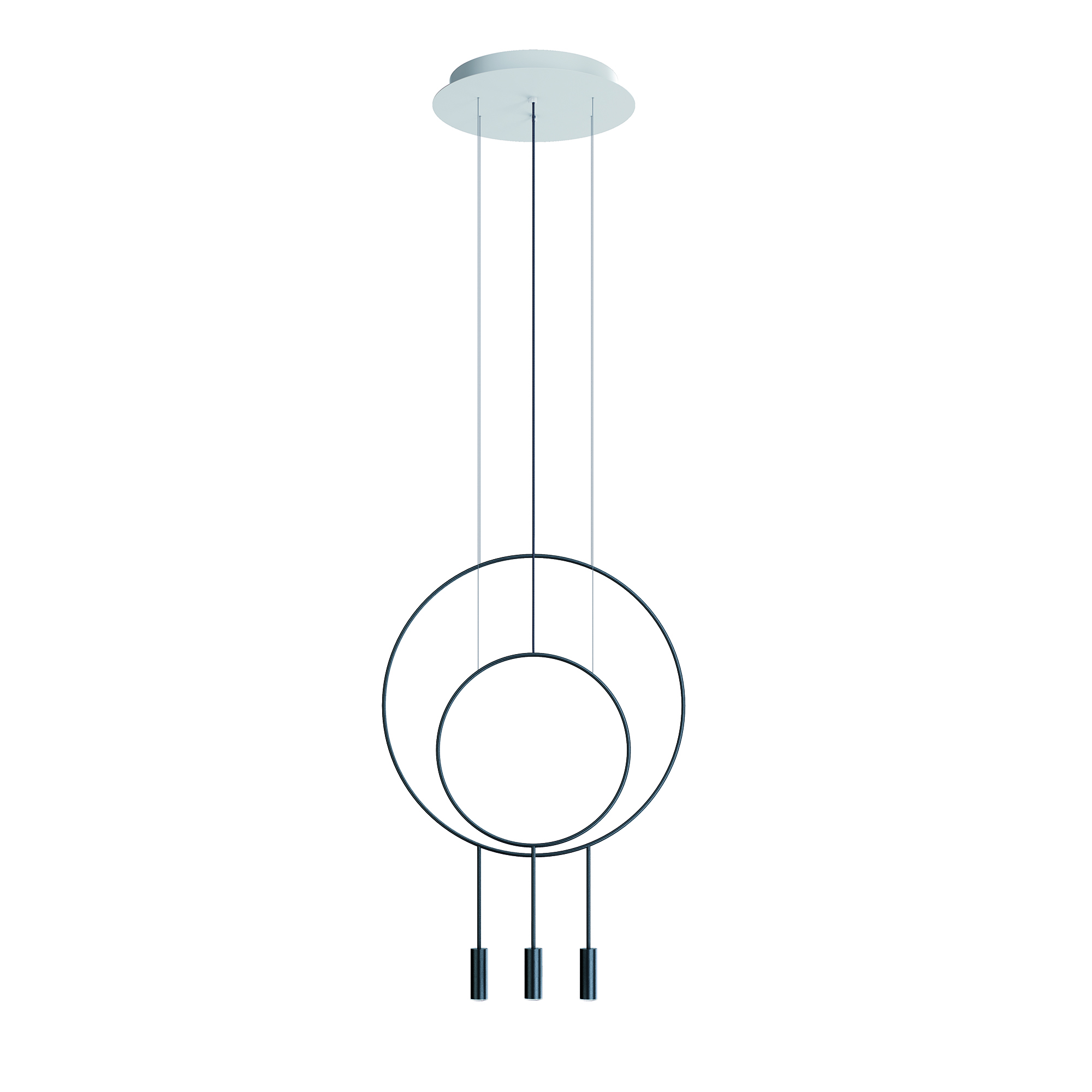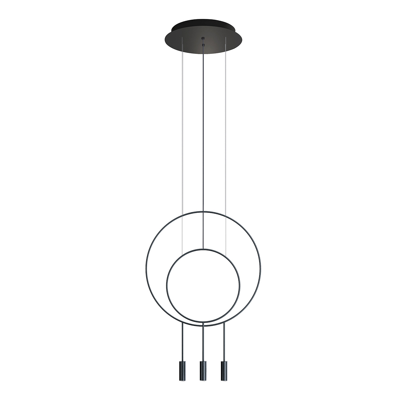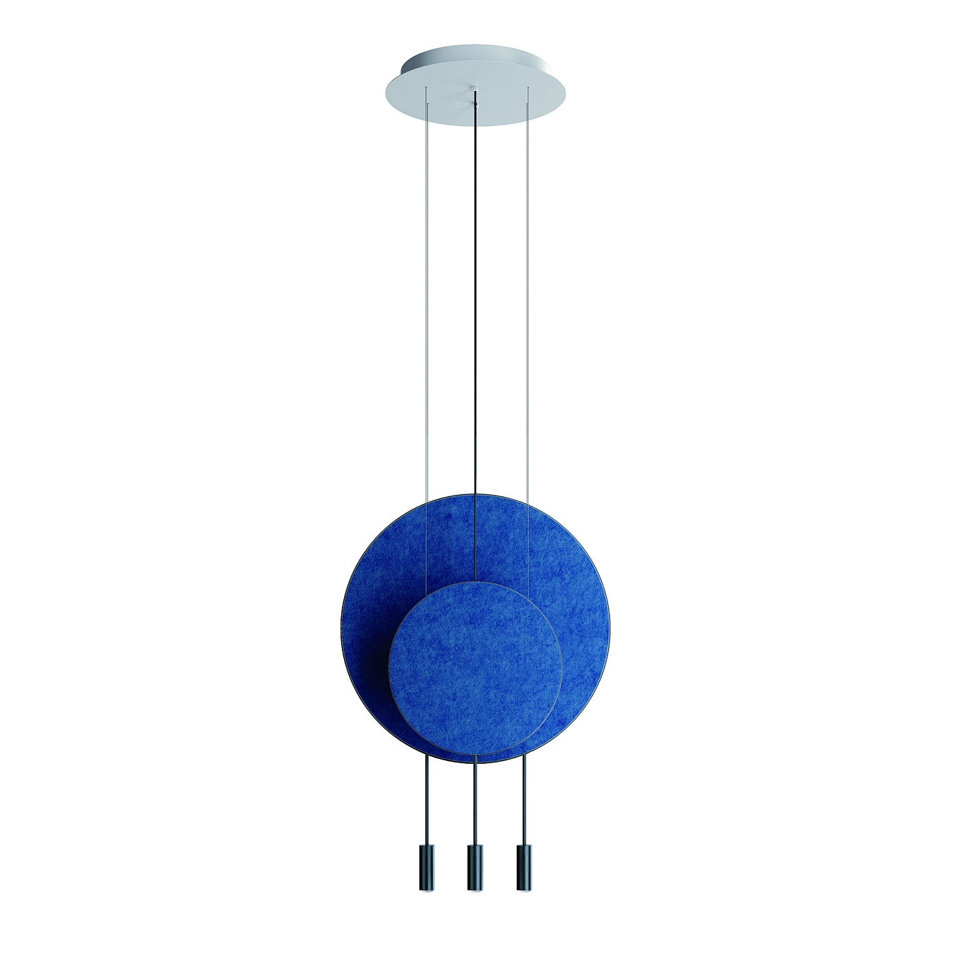 Стильный подвесной светильник с круглым корпусом, цилиндрическими алюминевыми плафонами с акриловыми оптическими линзами. Регулируемая высота. Дополнительный комплект для поворота акриловых оптических линз под углом 50º и декоративная звукопоглощающая панель.