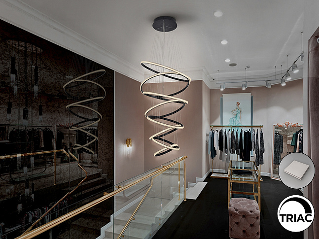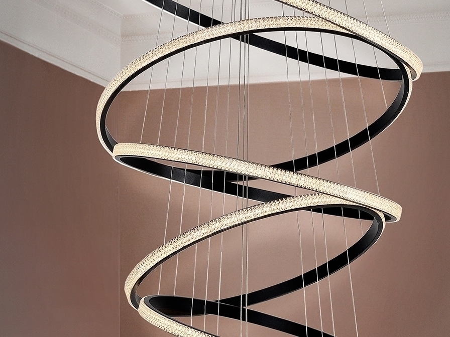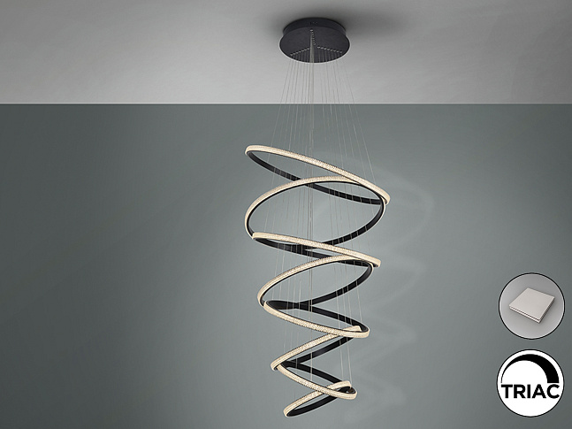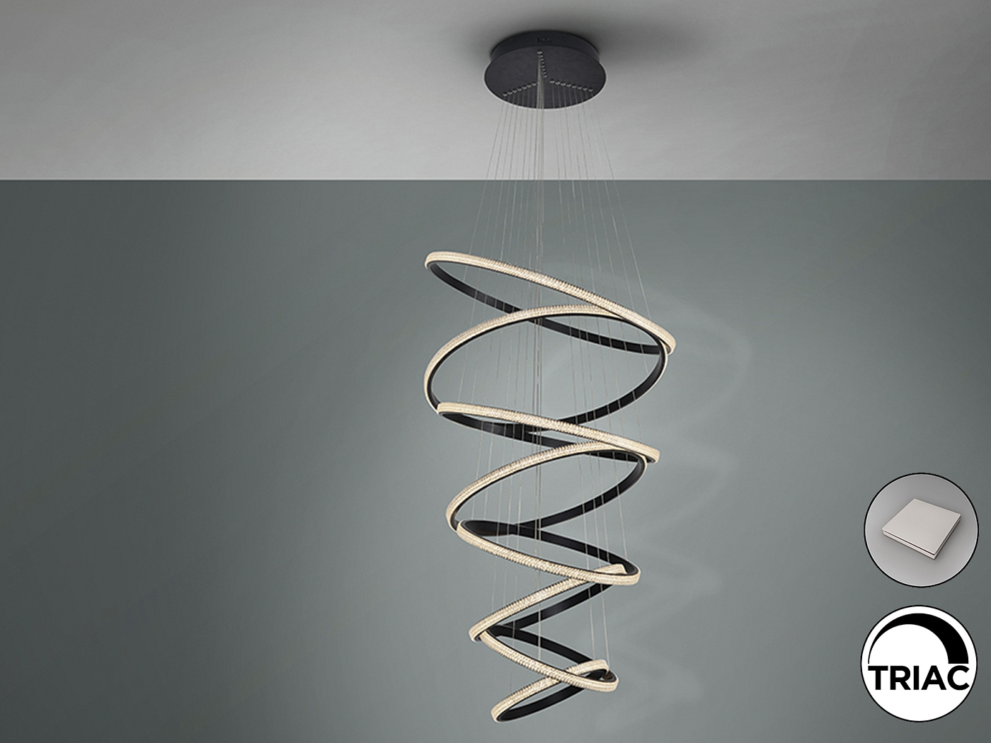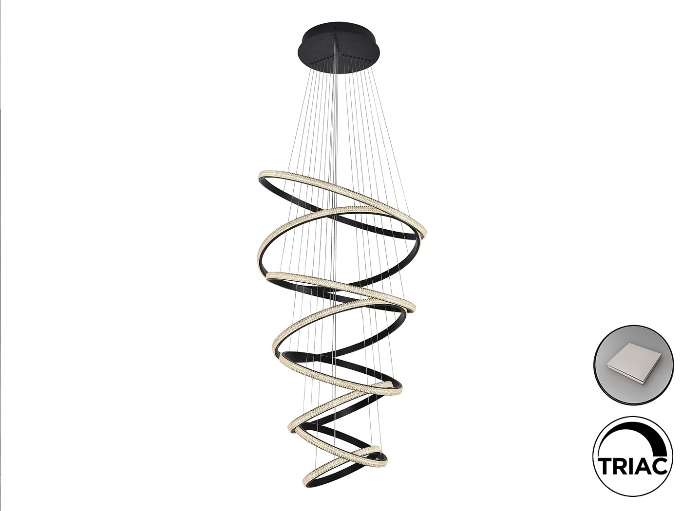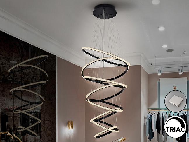 Лампа из металла и алюминия с матовой черной отделкой, подвергнутой пескоструйной обработке. Восемь регулируемых по высоте колец с диффузором из прозрачных акриловых деталей. Светодиоды мощностью 162 Вт. 8100лм. 3000 К. С РЕГУЛИРОВКОЙ. Драйвер TRIAC и НАБОР DIMMING SET включены. Этот продукт включает в себя светодиодные драйверы с триаком и регулировкой яркости 0–10 В. В комплект входит комплект затемнения с приемником и радиочастотным пультом дистанционного управления. Его также можно использовать с симисторным или настенным диммером 0–10 В. · Эта лампа поставляется с ГРАВИТАЦИОННЫМИ ПЕРЕКЛЮЧАТЕЛЯМИ для улучшения крепления к потолку.