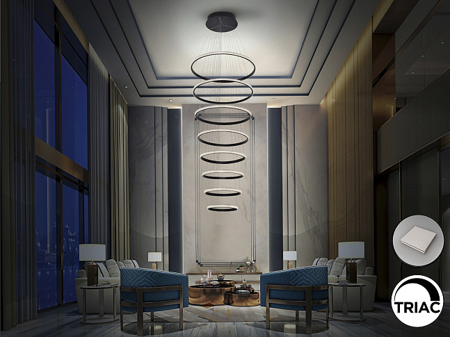 Лампа изготовлена из металла и алюминия, окрашена в черный матовый цвет. Восемь регулируемых по длине колец с рассеивателем из прозрачных акриловых деталей. Светодиод мощностью 162 Вт. 8100 лм. 4.000 К. С РЕГУЛИРОВКОЙ. Драйвер TRIAC и НАБОР DIMMING SET включены. Этот продукт включает в себя светодиодные драйверы с триаком и регулировкой яркости 0–10 В. В комплект входит комплект затемнения с приемником и радиочастотным пультом дистанционного управления. Его также можно использовать с симисторным или настенным диммером 0–10 В.