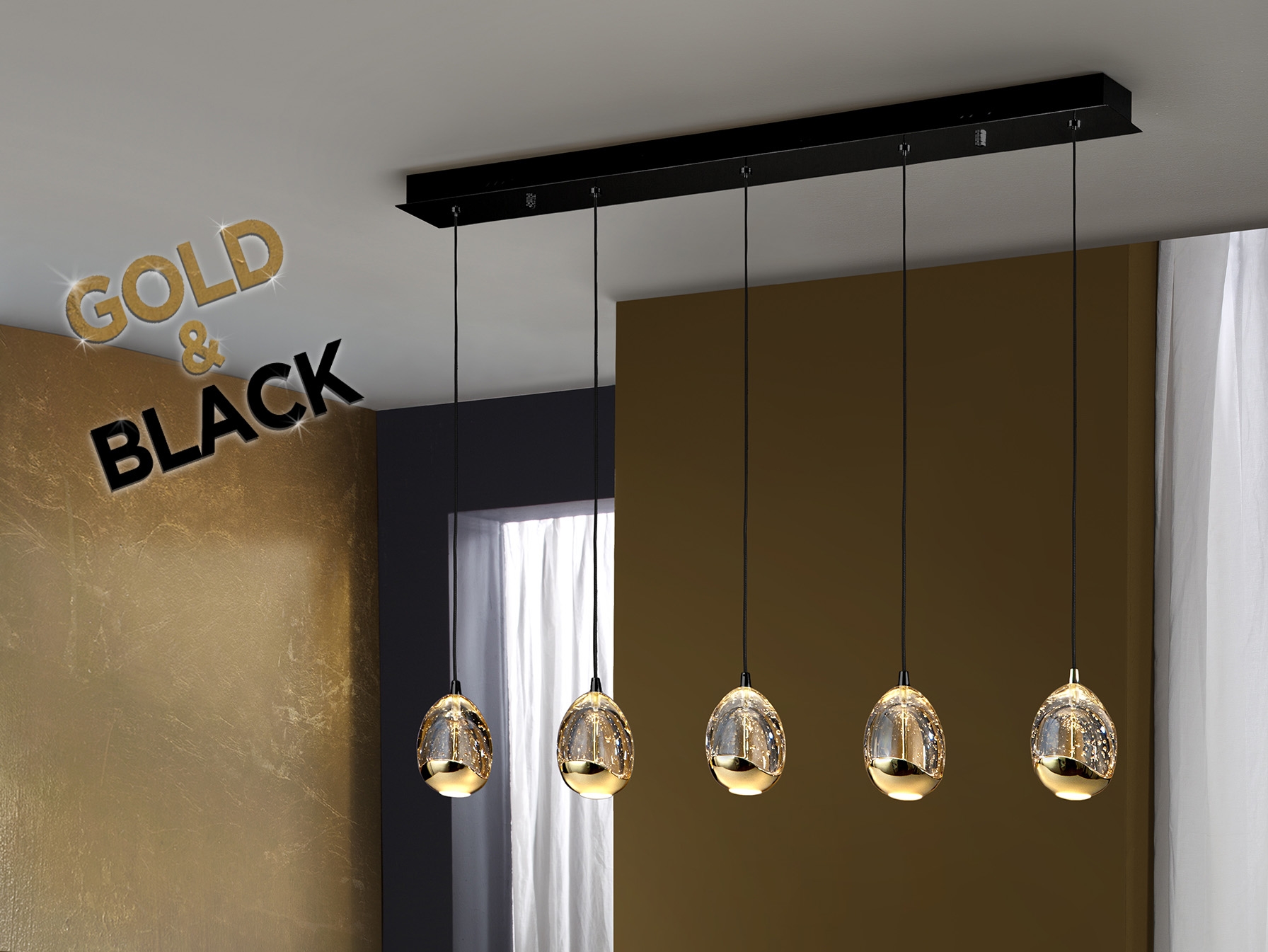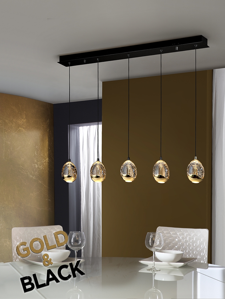 Лампа на 5 светодиодов, металл, матово-черная и блестящая золотая отделка. Каплевидные абажуры из цельного стекла с декоративными пузырьками внутри, в тонах шампанского. Регулируется по высоте. Светодиод 25 Вт. 2400 лм. 3000 К. С РЕГУЛИРОВКОЙ ЯРКОСТИ. В этом продукте используется светодиодный драйвер с симисторным типом и регулировкой яркости 0-10 В. Яркость можно регулировать с помощью настенного светодиодного диммера с этими функциями. · Эта лампа поставляется с ГРАВИТАЦИОННЫМИ ПЕРЕКЛЮЧАТЕЛЯМИ для улучшения фиксации на потолке.