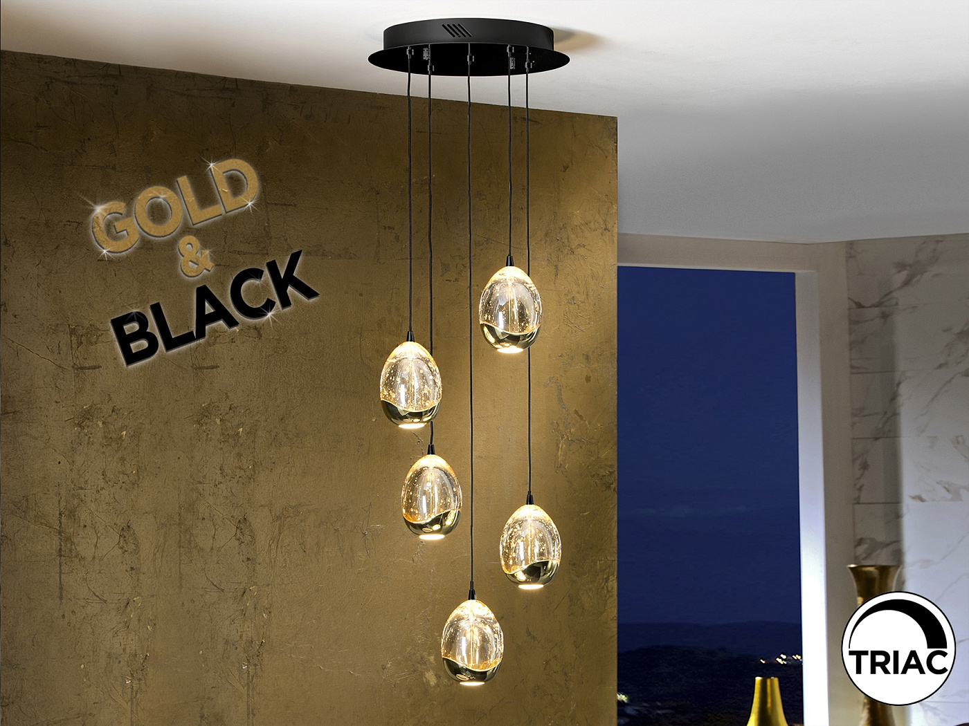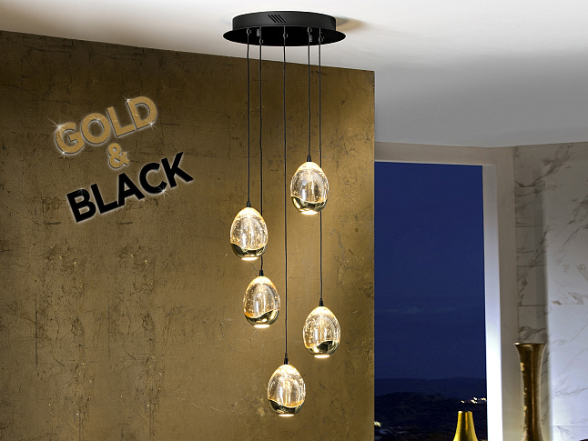 Лампа из 5 светодиодных ламп из металла, матово-черного и блестящего золотого цвета. Абажуры каплевидной формы из цельного стекла с декоративными пузырьками внутри, в тонах шампанского. Регулируется по высоте. Светодиод 25 Вт. 2400 лм. 3000 К. С РЕГУЛИРОВКОЙ ЯРКОСТИ В этом продукте используется светодиодный драйвер с симисторным типом и регулировкой яркости 0-10 В. Яркость можно регулировать с помощью настенного светодиодного диммера с этими функциями. · Эта лампа поставляется с ГРАВИТАЦИОННЫМИ ПЕРЕКЛЮЧАТЕЛЯМИ для улучшения фиксации на потолке.