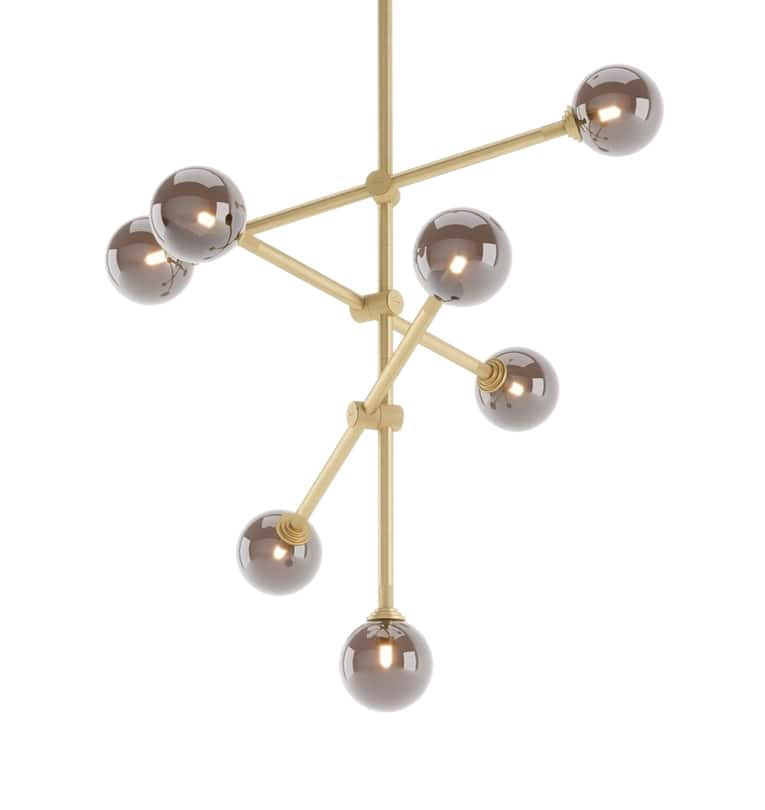 Потолочный светильник SAPA, идеально подходящий для высоких потолков, оснащен набором шарнирных кронштейнов, которые позволяют создавать различные конфигурации, а продуманное сочетание дымчатого стекла и латуни создает уникальный стиль освещения.