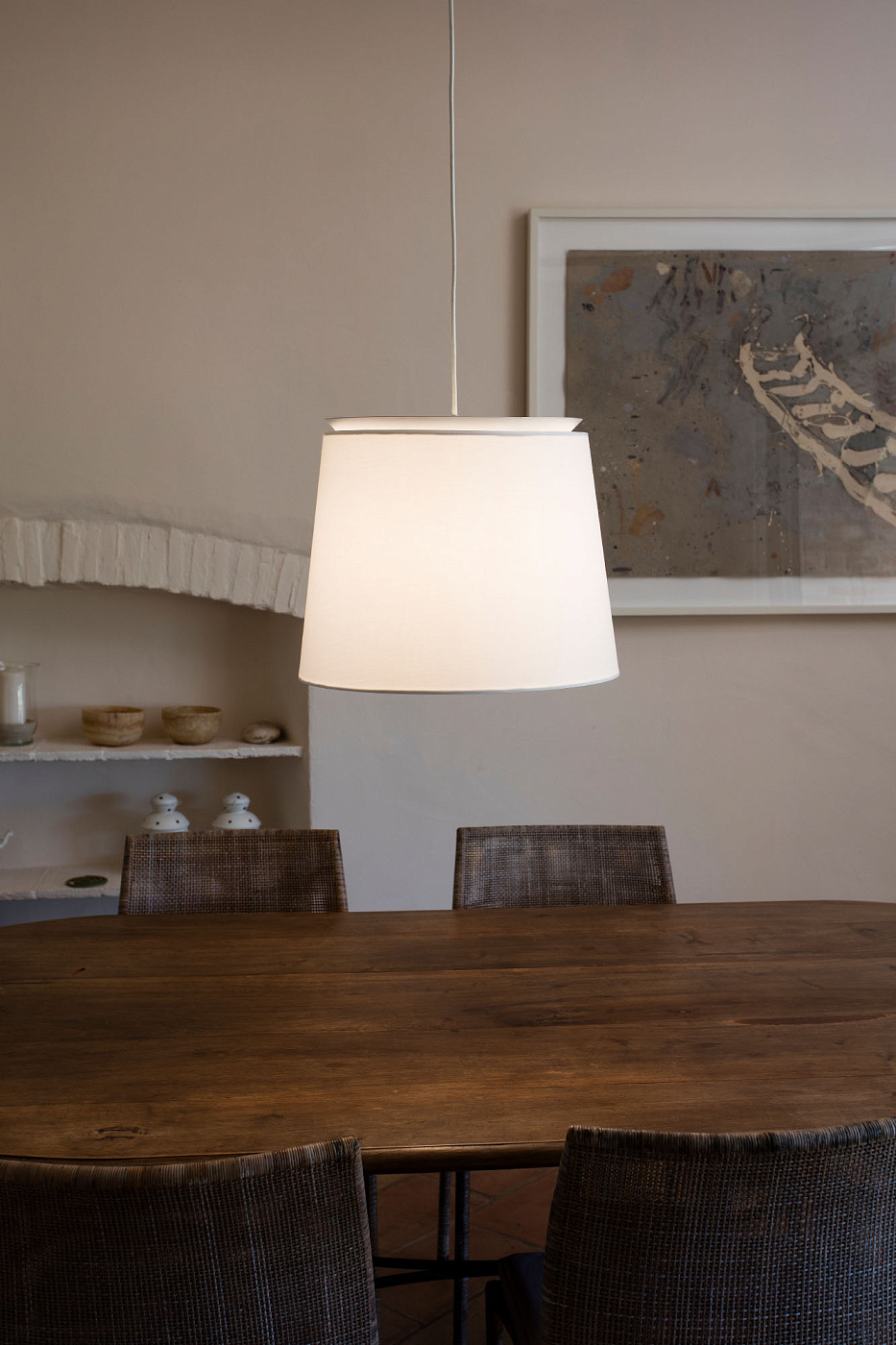 SAVOY - белый подвесной светильник с белым тканевым абажуром для внутреннего освещения, разработанный Исааком Пиньейро. Его структура характеризуется кольцом, расположенным в верхней части, где отражается свет, создавая красивое отражение.
