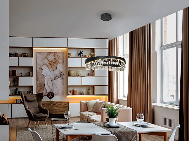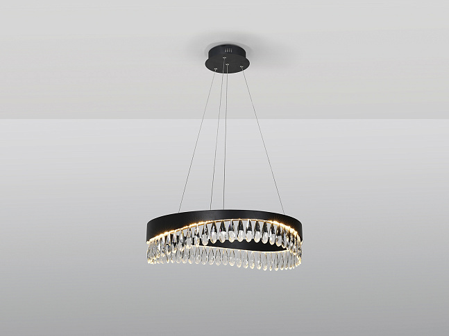 Лампа из металла и алюминия, матовая черная отделка. Рассеиватель из граненых хрустальных капель. Регулируется по высоте. Светодиодное освещение 30Вт, 1300Лм, 3000К.