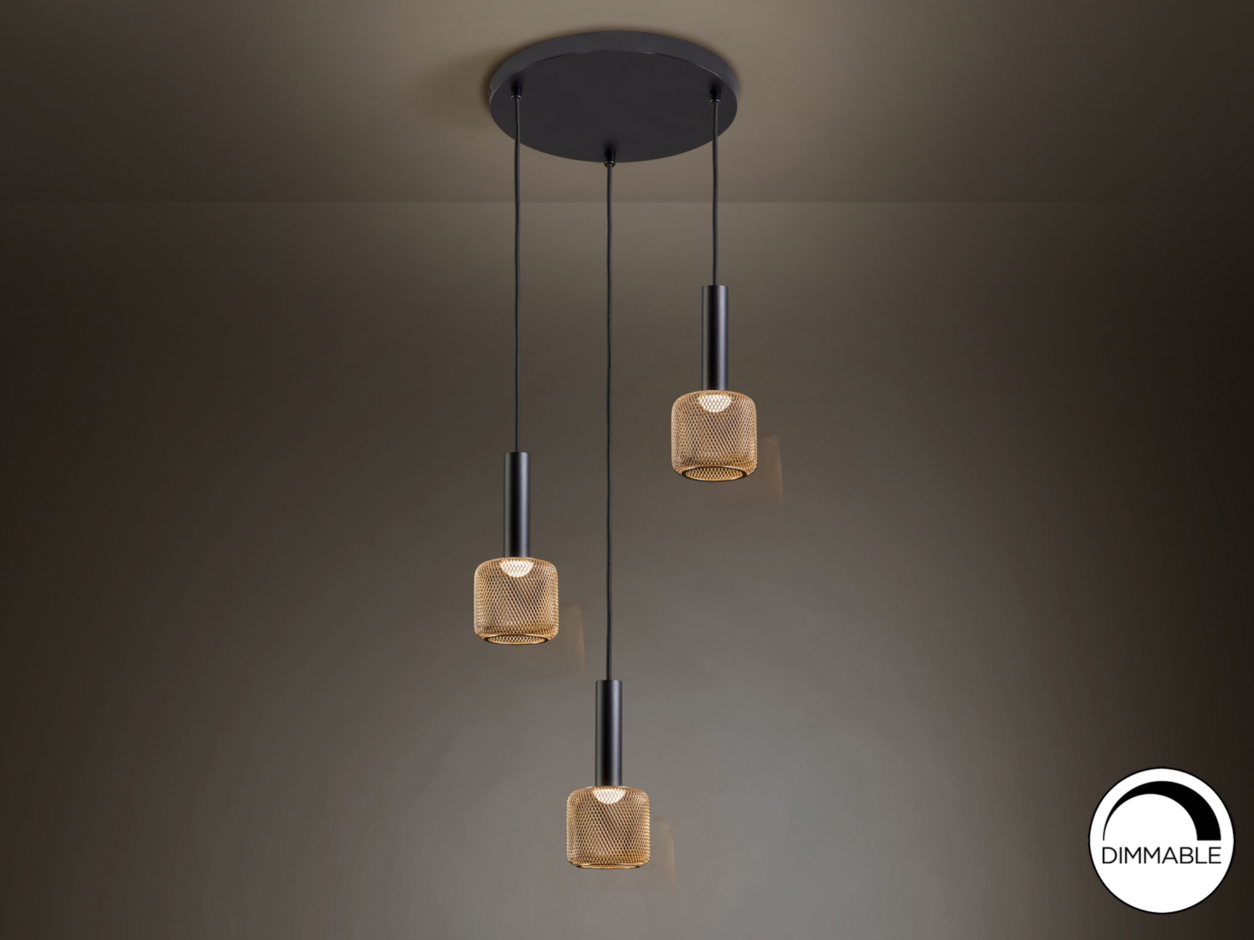 3-х ламповый светодиодный светильник из матового черного металла и абажура из металлической блестящей металлической сетки, рассеиватель из опалового акрила. Светодиод 15 Вт, 1350 лм, 3000 К. С возможностью затемнения.