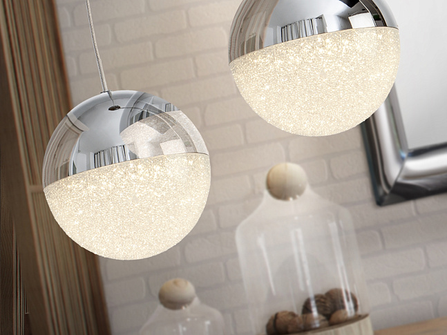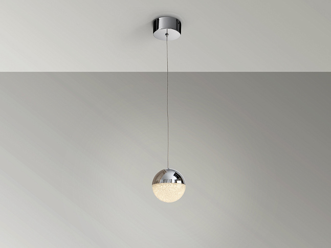 Подвесной светильник с 1 лампой, из металла с покрытием "хром", шарообразные плафоны Ø12 из металла и фактурного внутри поликарбоната, с регулируемой высотой. 4,8W LED, 3000 K.