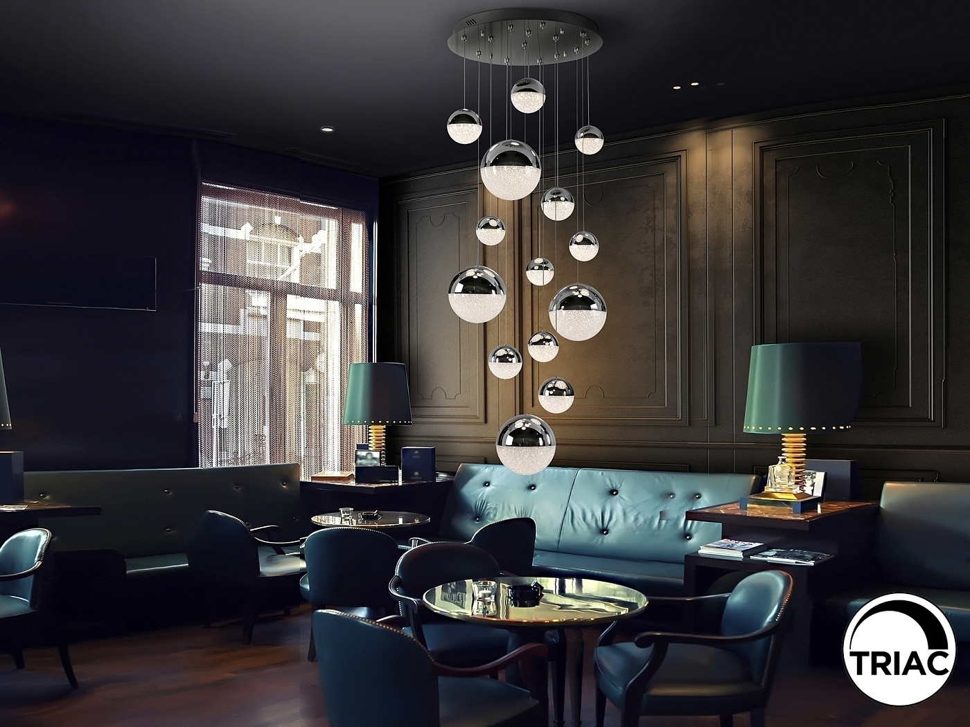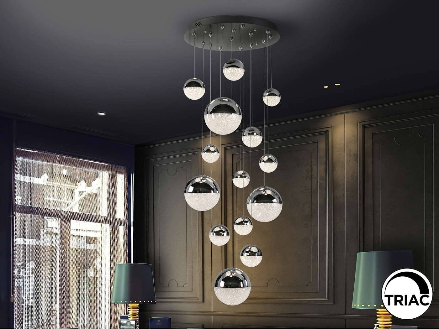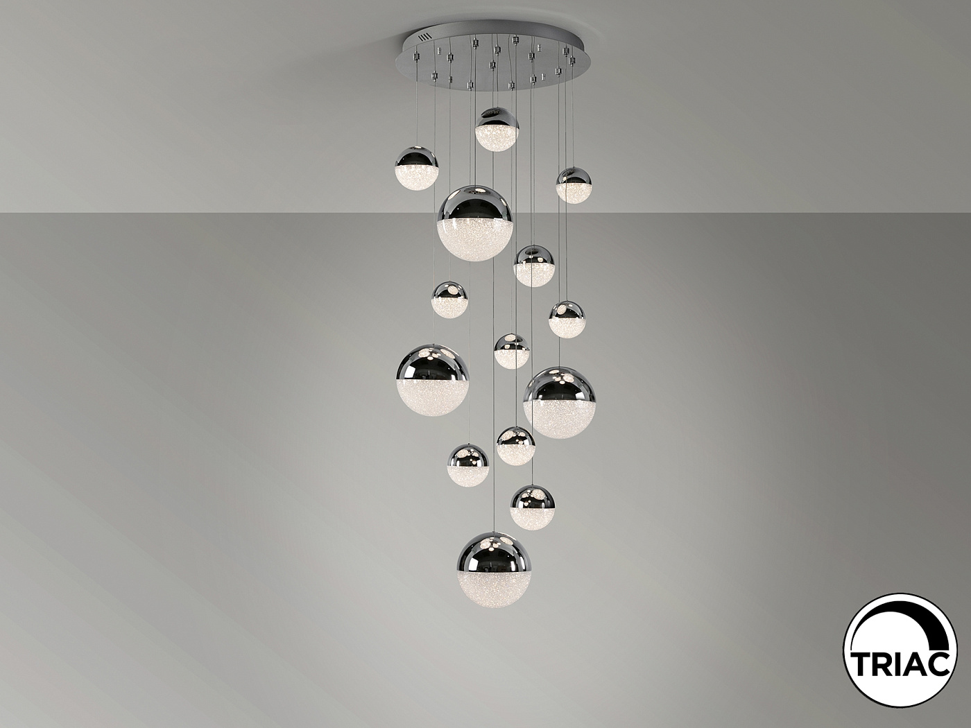 Светильник из 14 светодиодов, выполнен из хромированного металла. Сферические плафоны диаметром 10, 12, 20 см из поликарбоната с текстурой внутри и металлом с хромированной отделкой. Светодиод 78,6 Вт, 3000 К, 5 502 лм, РЕГУЛИРУЕМАЯ РЕГУЛИРОВКА. Драйвер TRIAC и НАБОР DIMMING SET включены В этом продукте используется светодиодный драйвер с триаком и диммером 0–10 В, в комплект входит диммер с диммером и радиочастотным дистанционным управлением, или его можно затемнить с помощью триака или настенного диммера 0–10 В. В НАЛИЧИИ ВЫСОТОЙ 5 МЕТРОВ. АРТИКУЛ: 793269G · Эта лампа поставляется с ГРАВИТАЦИОННЫМИ ПЕРЕКЛЮЧАТЕЛЯМИ для улучшения крепления к потолку.