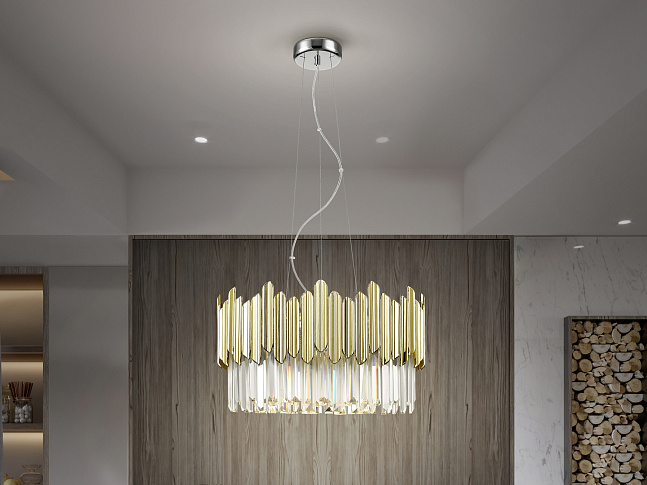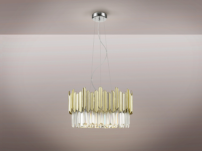 Светильник из металла, хромированная отделка. Абажур из граненых стеклянных призм с деталями из АБС-пластика с позолоченным покрытием. ·В комплект поставки входят 6 светодиодов G9 мощностью 6 Вт. Эта лампа поставляется с гравитационными переключателями для улучшения крепления к потолку.