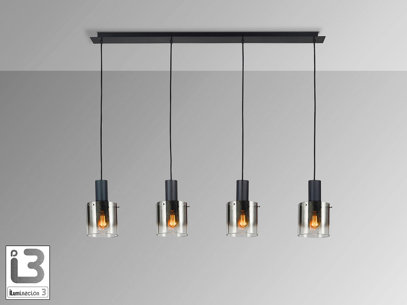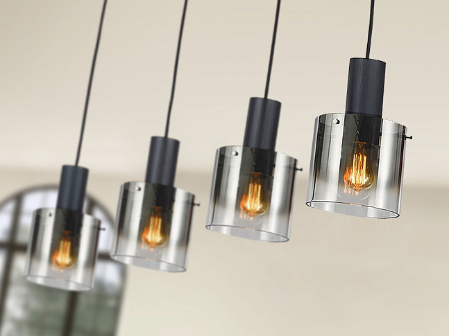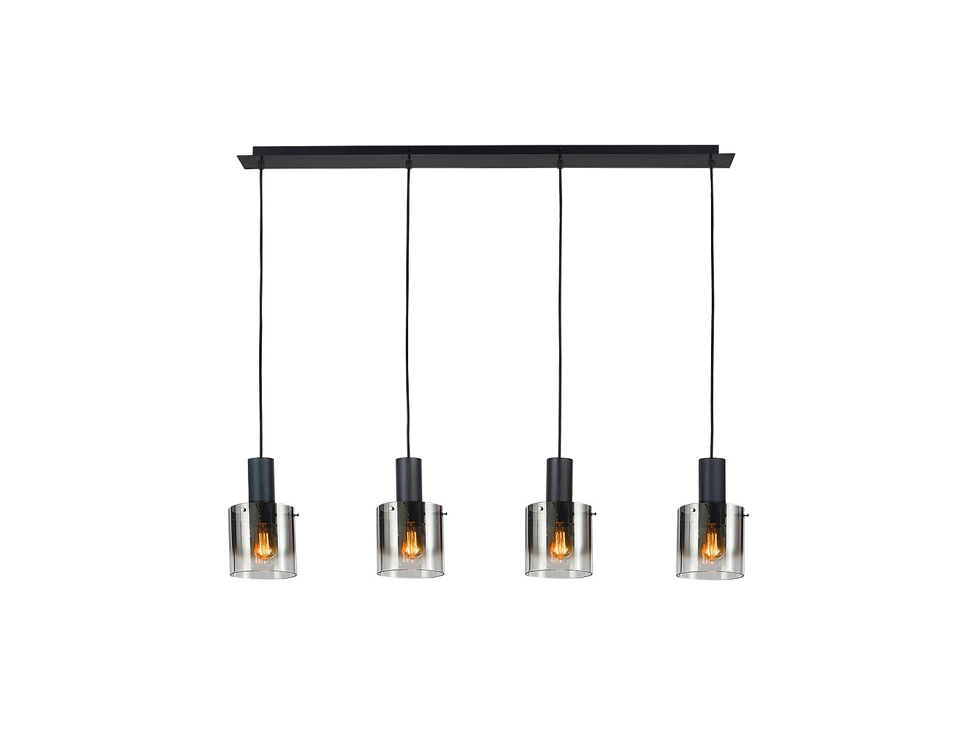 Лампа из металла, покрытого матовым чёрным лаком. 4 матовых абажура из дымчатого стекла. Текстильный кабель. Регулируется по высоте. Цоколь E27.