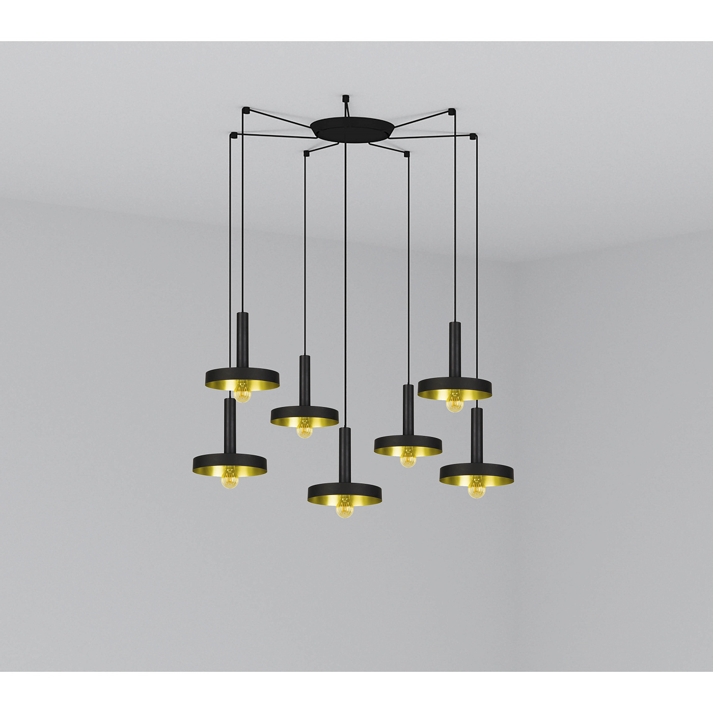 WHIZ - это семейство дизайнерских светильников, созданное Кристофом Фридрихом Вагнером, которое включает в себя модные отделки, такие как сочетание атласного золота и черного. Этот дизайнерский кулон в черно-золотом цвете отлично подойдет для интерьерного освещения. Версия с несколькими потолочными розетками с 7 лампами.