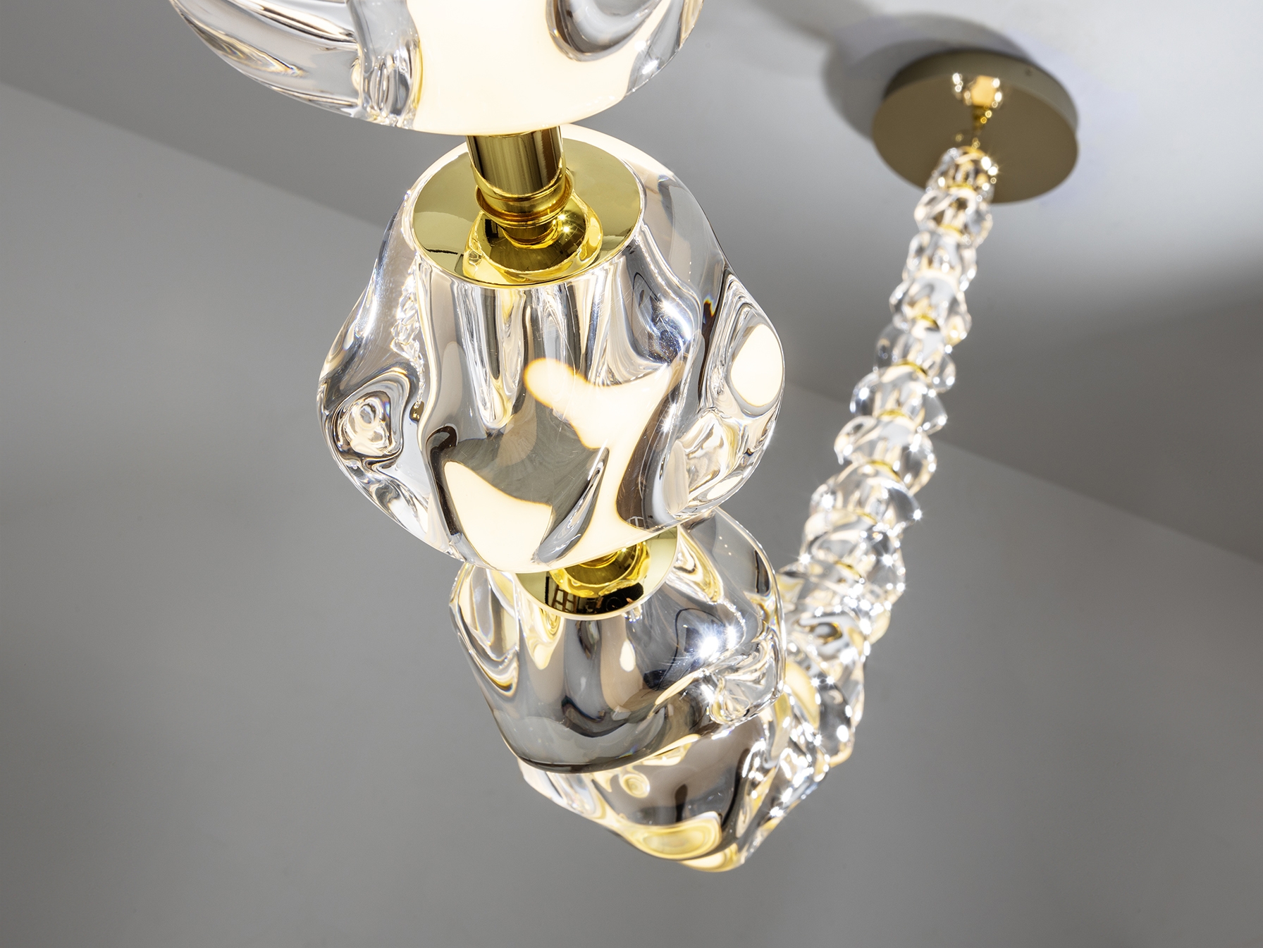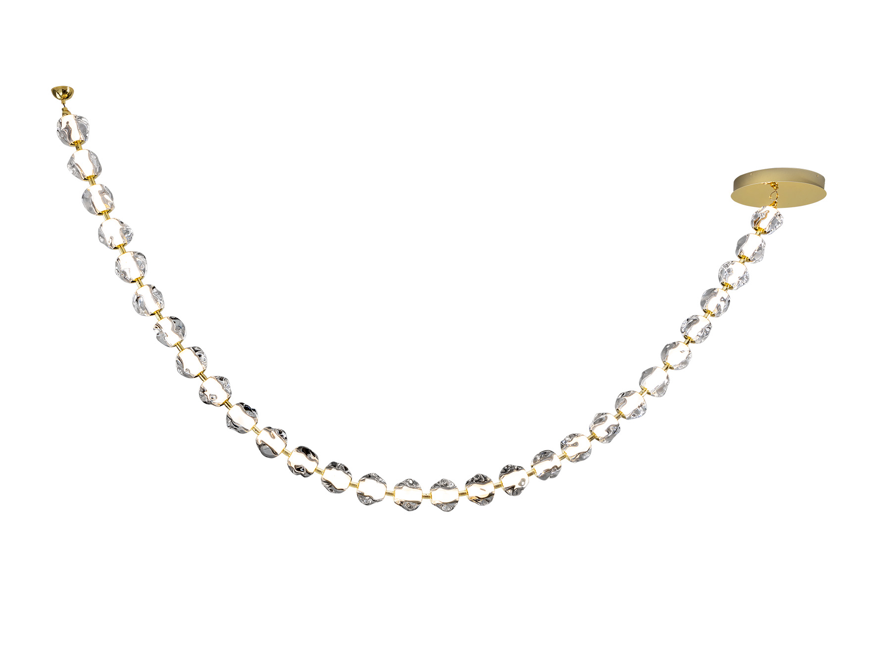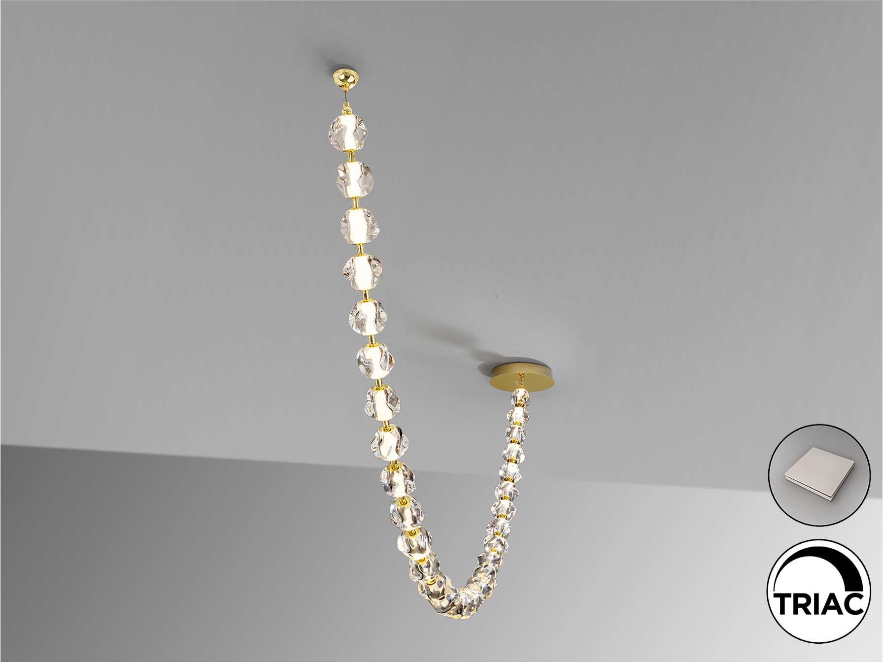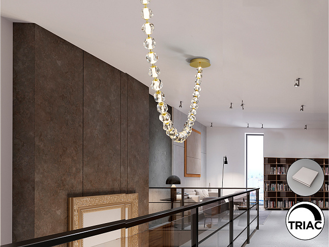 Лампа из металла золотистого цвета и 29 прозрачных акриловых плафонов. Светодиод мощностью 105 Вт, 8704 лм, 3000 К. В комплект входят драйвер TRIAC и набор для диммирования. · В комплект поставки этой лампы входят ГРАВИТАЦИОННЫЕ ЗАЖИМЫ для более надёжной фиксации на потолке.