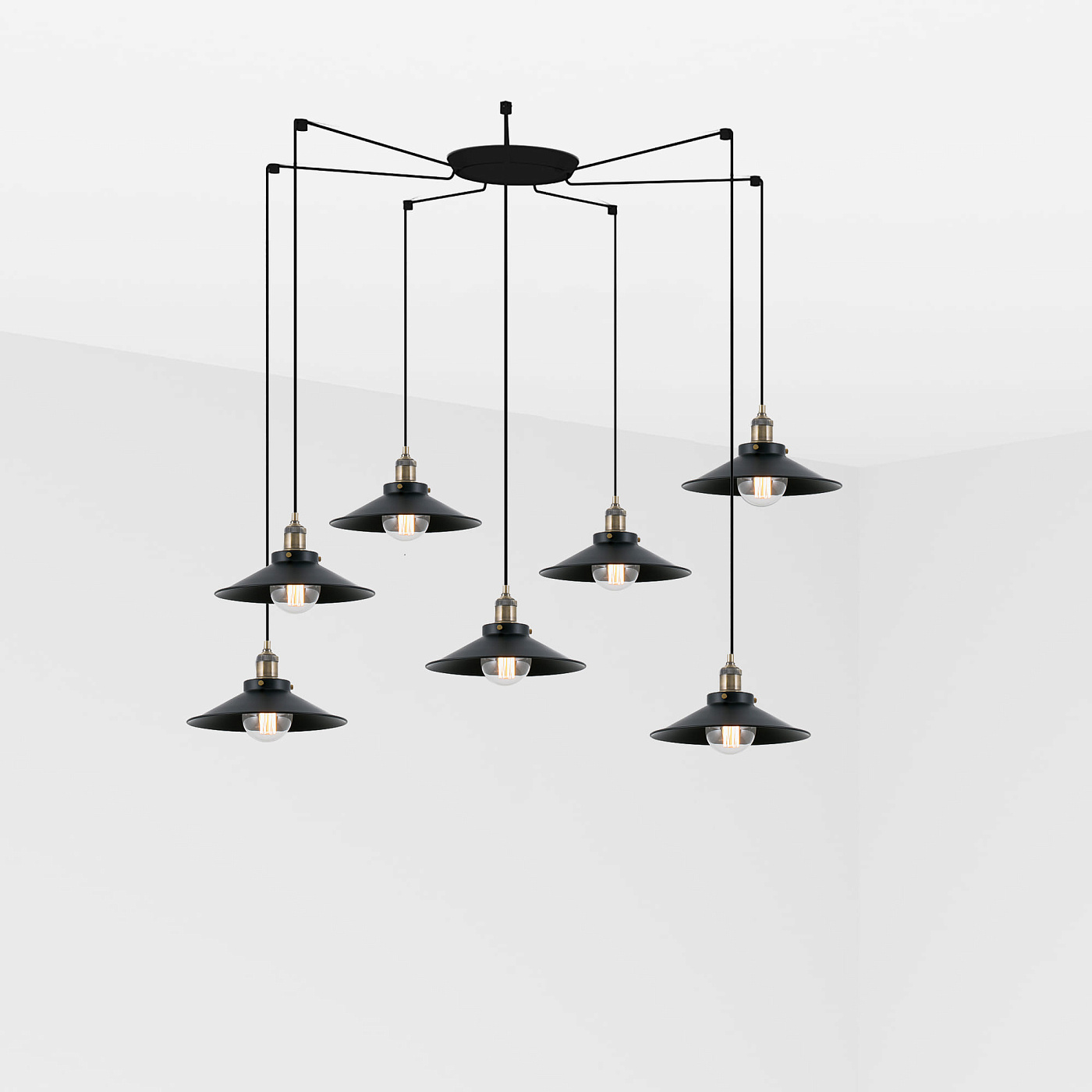 Современный подвесной светильник из металла. Версия с несколькими 7-ламповыми плафонами. Световые решения, разработанные для мировых рынков, совместимы с сетевыми напряжениями: 110–120 В и 220–240 В.