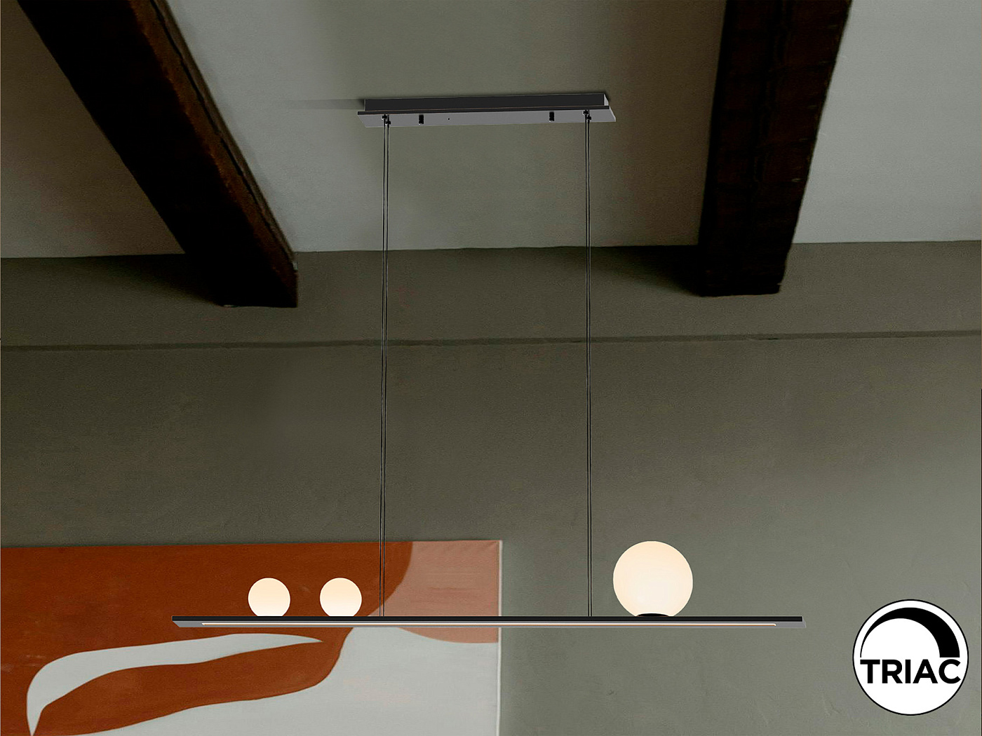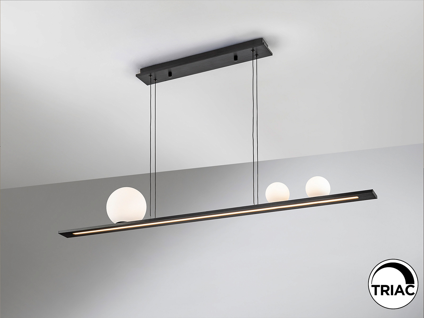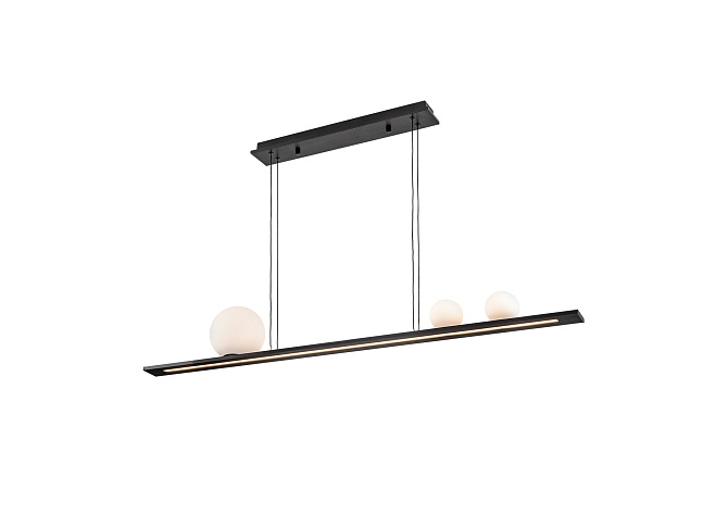 Лампа из матового алюминия, черная отделка. 3 сферических стеклянных плафона белого цвета и нижний опаловый акриловый рассеиватель. Светодиод 31 Вт, 1204 лм, 3000 К