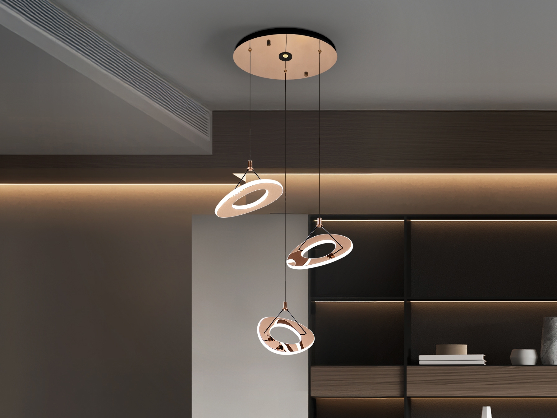 Светильник с 3 лампами и 1 зенитным светильником. Изготовлен из стали с покрытием из блестящего розового золота. Рассеиватель из опалового акрила. Регулируемая высота. Светодиодное освещение мощностью 60 Вт, цветовая температура 2700 К. · Этот светильник оснащен GRAVITY TOGGLES для улучшения фиксации на потолке.