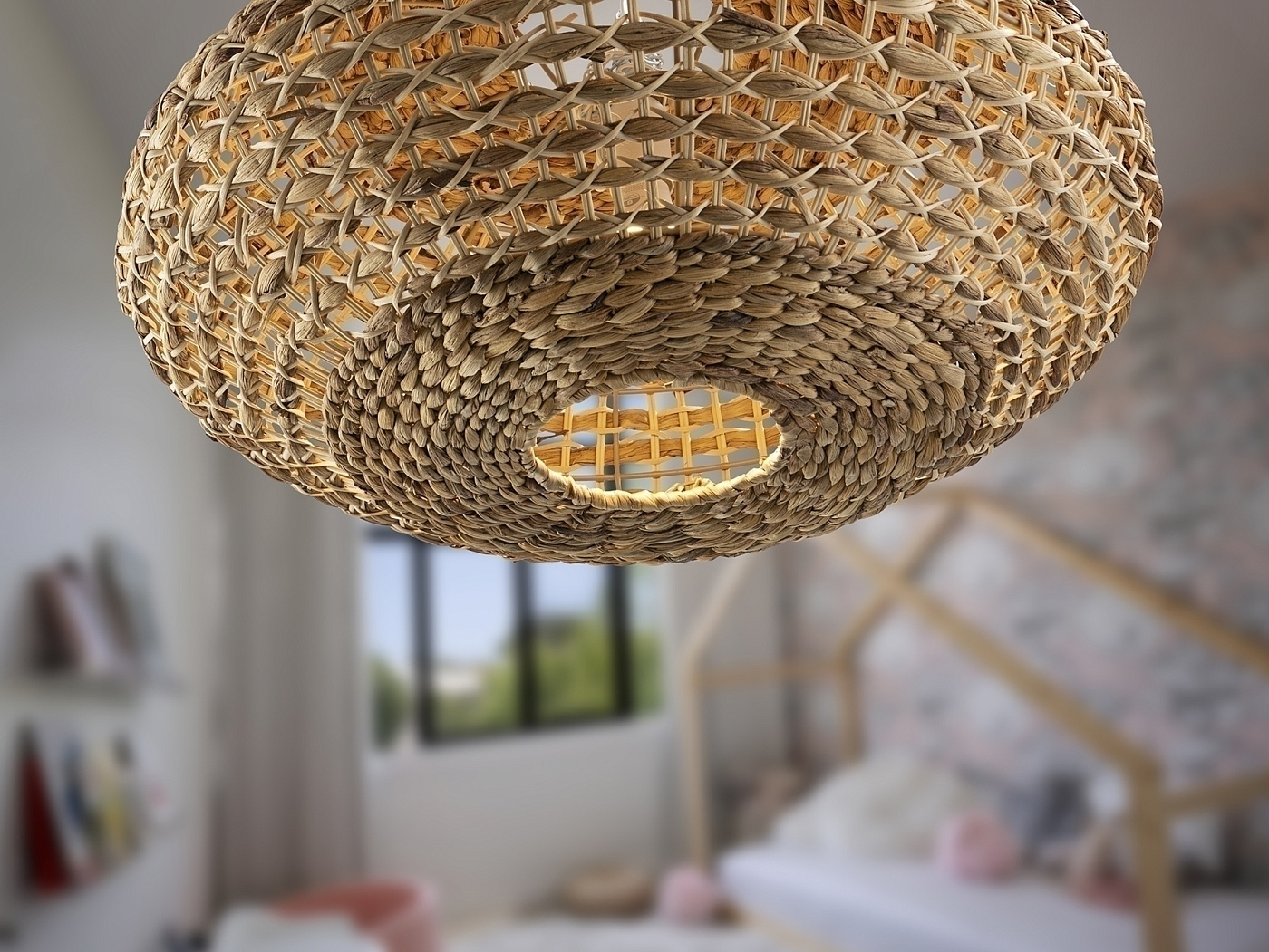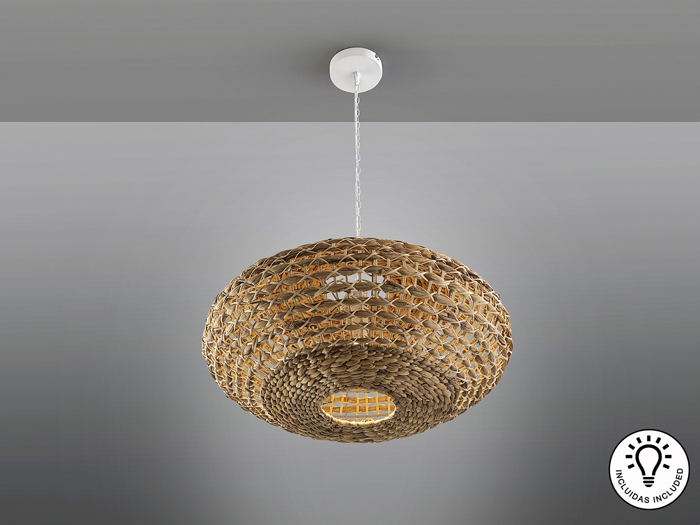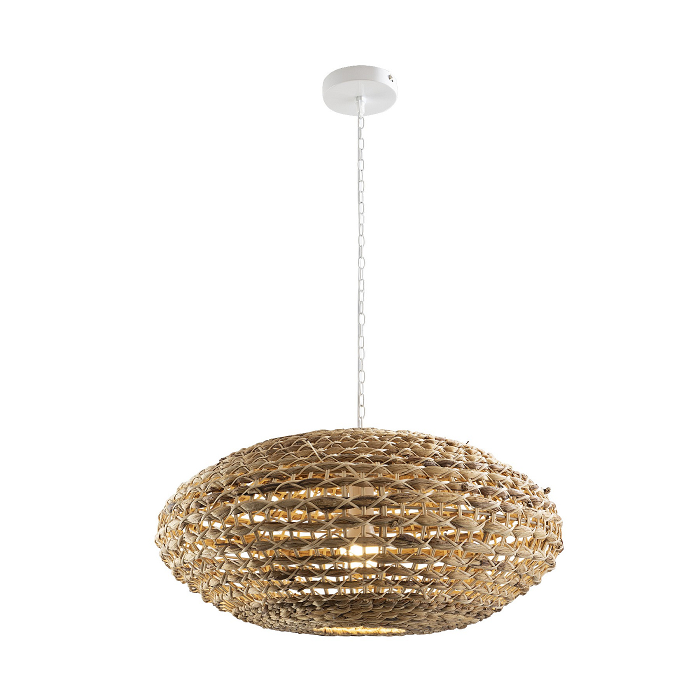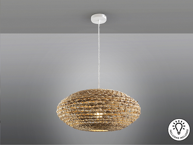 Большой светильник на 1 лампу, выполнен из металла белого цвета. Абажур из ротангового волокна и плетеный водный гиацинт с натуральной отделкой. ·В комплект поставки входит 1 светодиод E27 мощностью 10 Вт. Эта лампа поставляется с гравитационными переключателями для улучшения крепления к потолку.