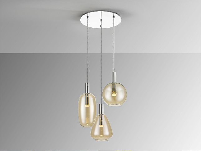 Лампа из 3 светильников, изготовленных из хромированного металла. Янтарные стеклянные абажуры и опаловый акриловый рассеиватель. Регулируемая высота. Светодиод 15 Вт, 1350 лм, 3000 К Это устройство может быть затемнено с помощью специального настенного светодиодного диммера.