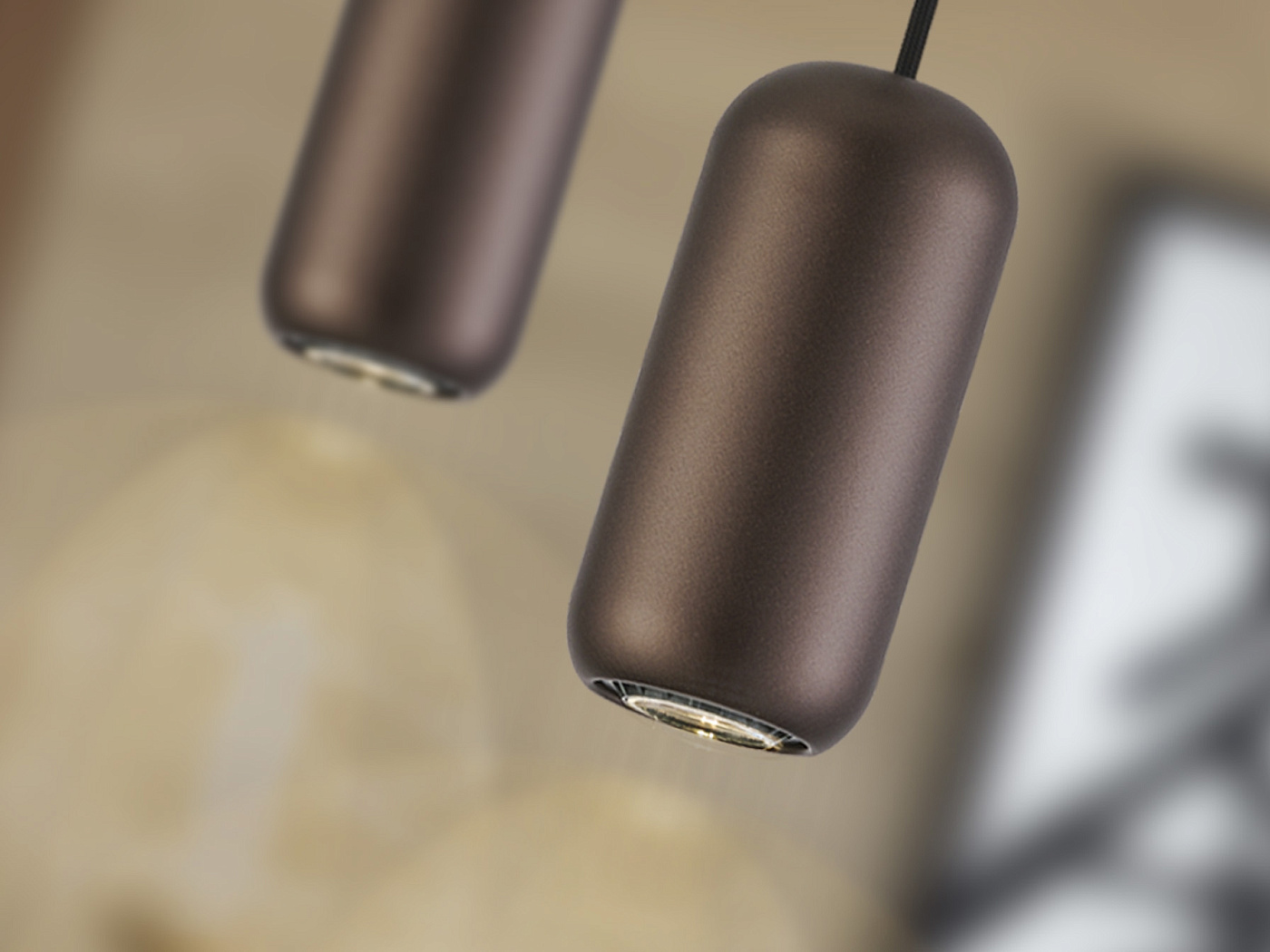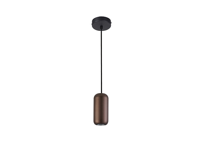 Лампа из металла, окрашенного в матовый чёрный цвет. Тёмно-коричневый металлический абажур. Регулируется по высоте. Цоколь GU10.