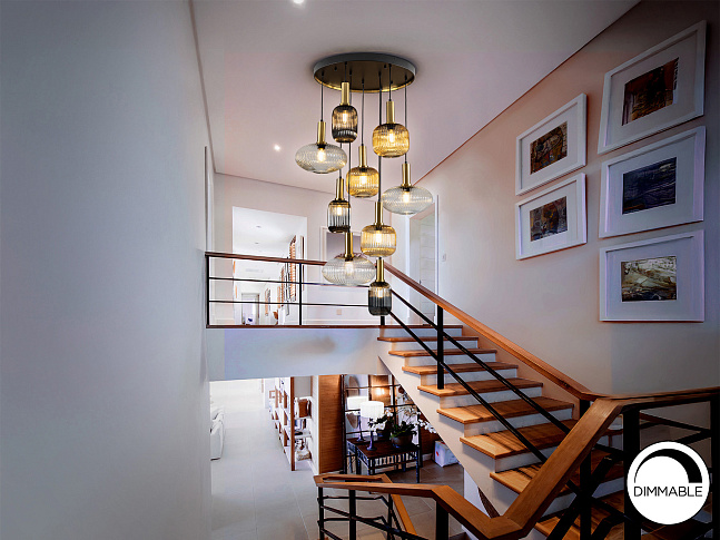 Лампа на 9 ламп из металла, отделка матово-черная, с деталями из сатинированной латуни. Абажуры из формованного стекла с прозрачной, янтарной и мерцающей дымчато-серой отделкой. Регулируется по длине до 500 см. ·В комплект поставки входят 9 светодиодов E27 мощностью 8 Вт. РЕГУЛИРУЕМАЯ ЯРКОСТЬ. Эта лампа оснащена ГРАВИТАЦИОННЫМИ ПЕРЕКЛЮЧАТЕЛЯМИ для улучшения фиксации на потолке.
