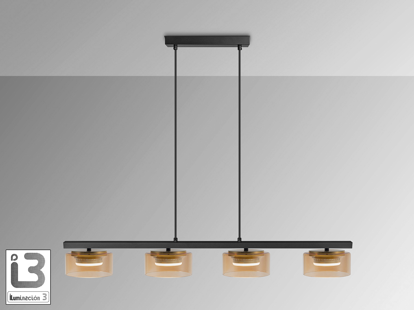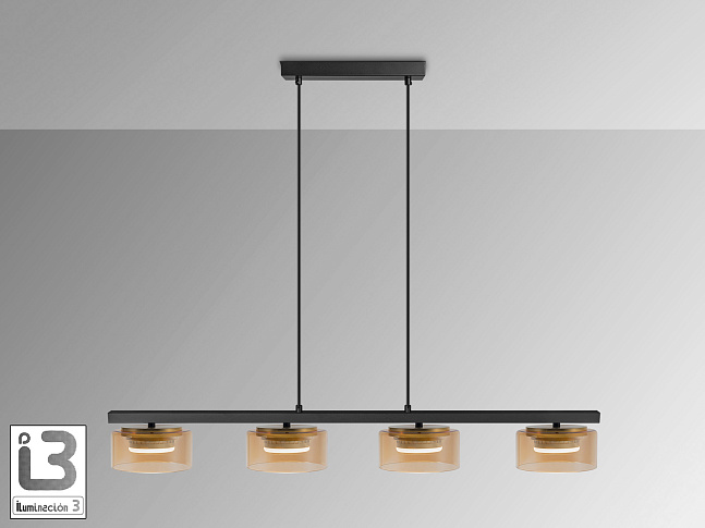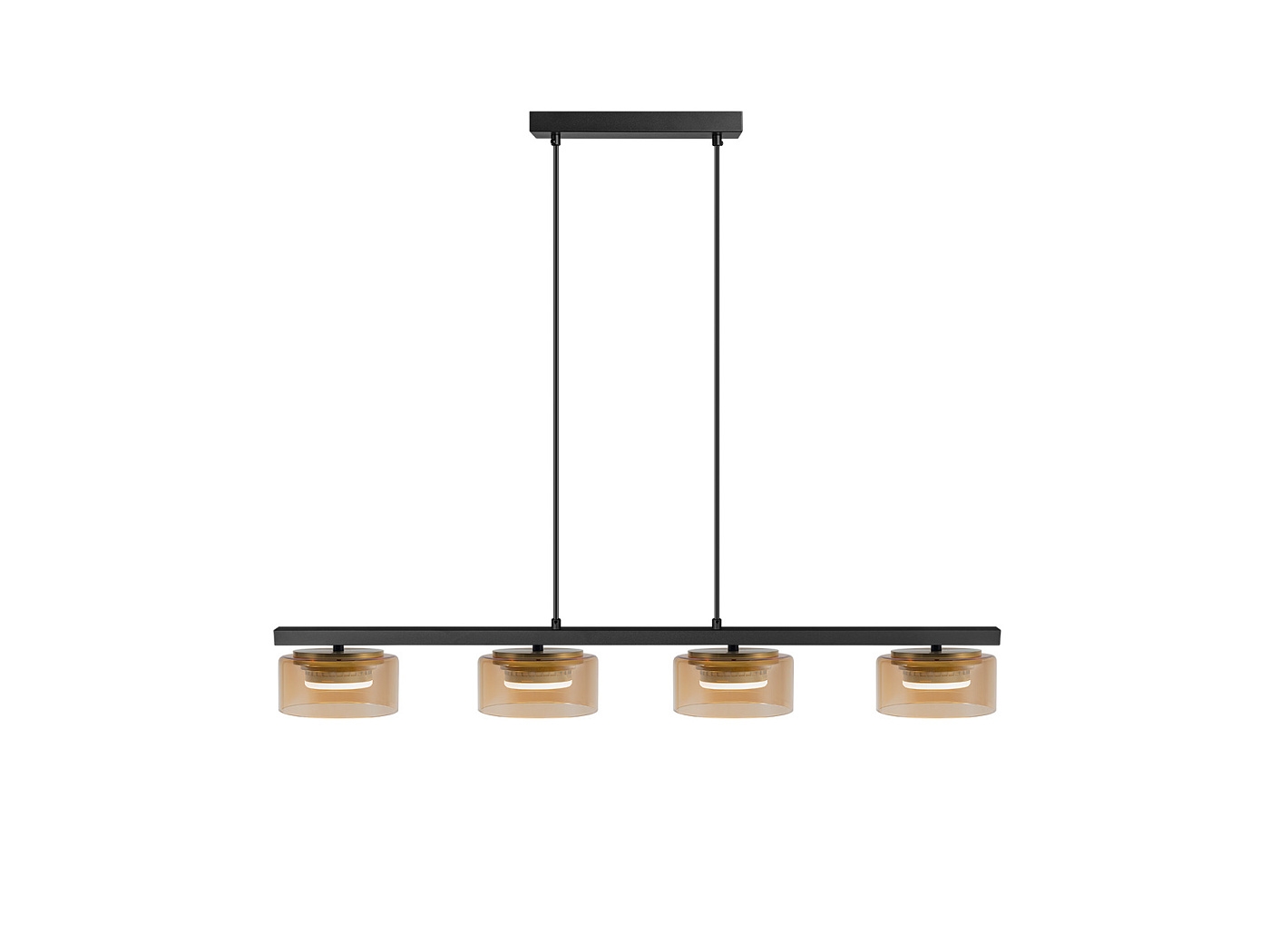 Лампа из металла, окрашенного в матовый чёрный и золотой цвета. 4 плафона из янтарного стекла. Регулируется по высоте.