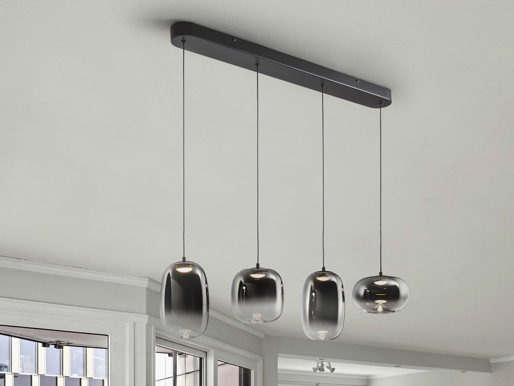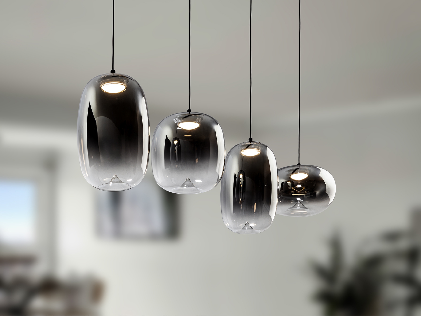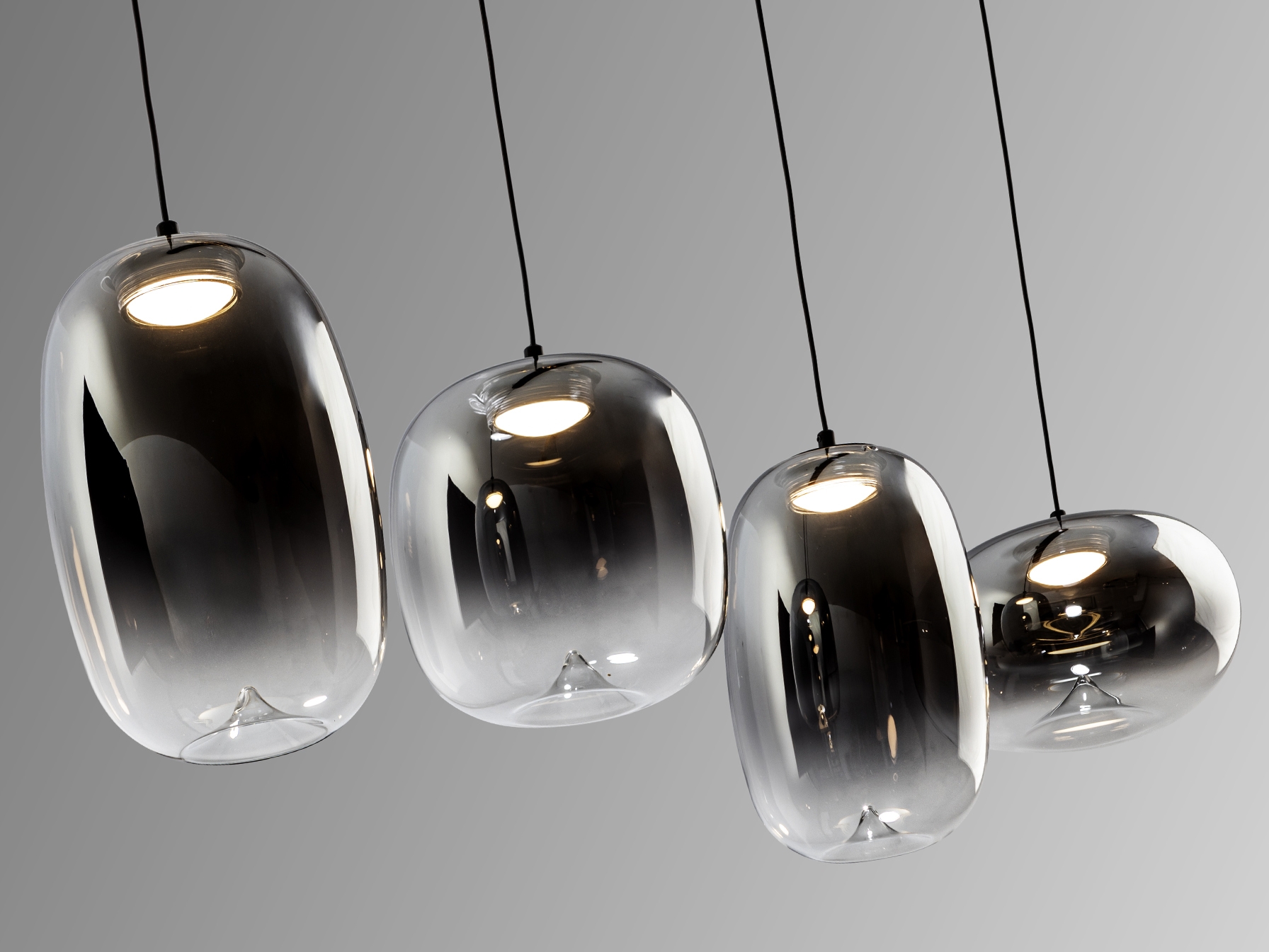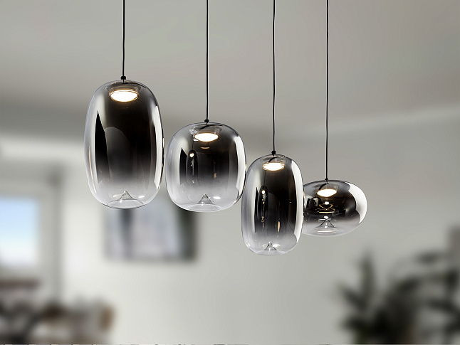 Лампа на 4 лампы из металла с матово-черной отделкой. Абажур из дутого стекла с размытой дымчато-серой отделкой, переходящей в прозрачную. Регулируемая высота. Светодиод 24 Вт, 1400 лм, 3000 К. · Эта лампа оснащена ГРАВИТАЦИОННЫМИ ПЕРЕКЛЮЧАТЕЛЯМИ для улучшения фиксации на потолке. Доступна версия на 110 В.