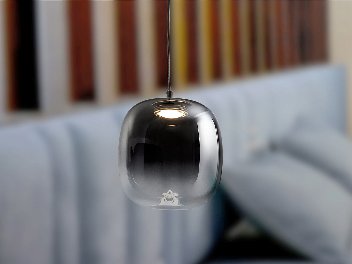Лампа на 1 лампу из металла с матово-черной отделкой. Абажур из дутого стекла с размытой дымчато-серой отделкой, переходящей в прозрачную. Регулируемая высота. Светодиод 6 Вт, 400 лм, 3000 К. · Эта лампа оснащена ГРАВИТАЦИОННЫМИ ПЕРЕКЛЮЧАТЕЛЯМИ для улучшения фиксации на потолке. Доступна версия на 110 В.