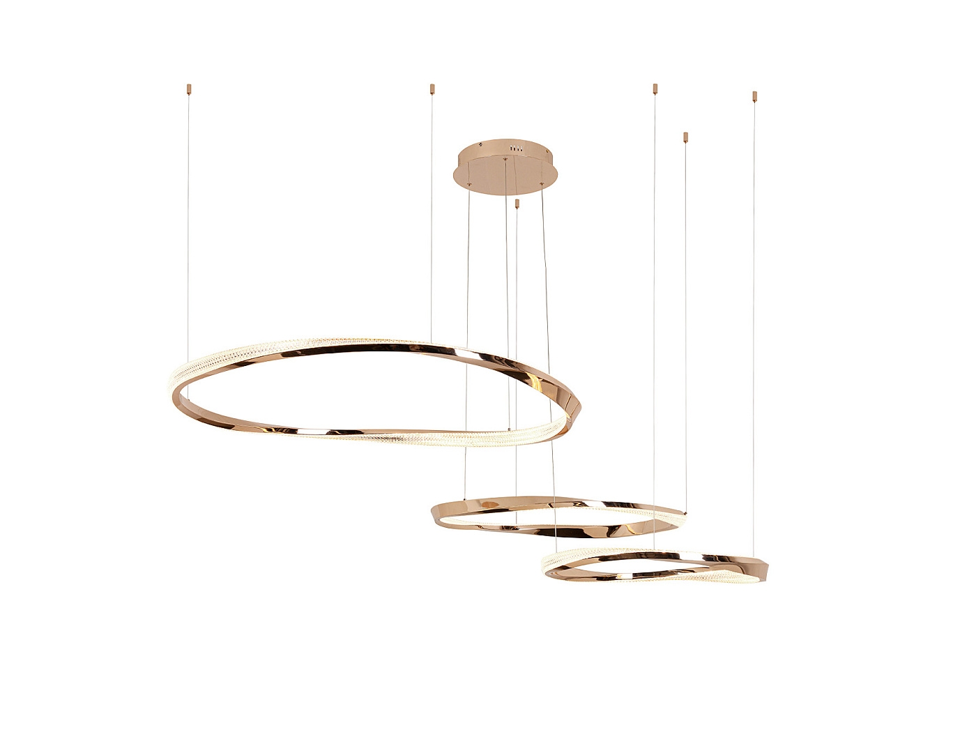 Лампа из 3 колец (Ø60, Ø80, Ø100 см), изготовленных из стали и алюминия, с блестящим золотым покрытием. Прозрачный гранёный акриловый рассеиватель. Регулируется по высоте. Светодиод мощностью 120 Вт, 8400 лм, 3000 К. С возможностью регулировки яркости. В комплект входит драйвер TRIAC и набор для регулировки яркости. В этом изделии используется светодиодный драйвер с симистором и регулировкой яркости от 0 до 10 В, в комплект входит диммер с регулятором яркости и радиочастотным пультом дистанционного управления, а также диммер с симистором или настенный диммер с регулировкой яркости от 0 до 10 В. · В комплект поставки лампы входят ГРАВИТАЦИОННЫЕ КНОПКИ для более удобной установки на потолке.