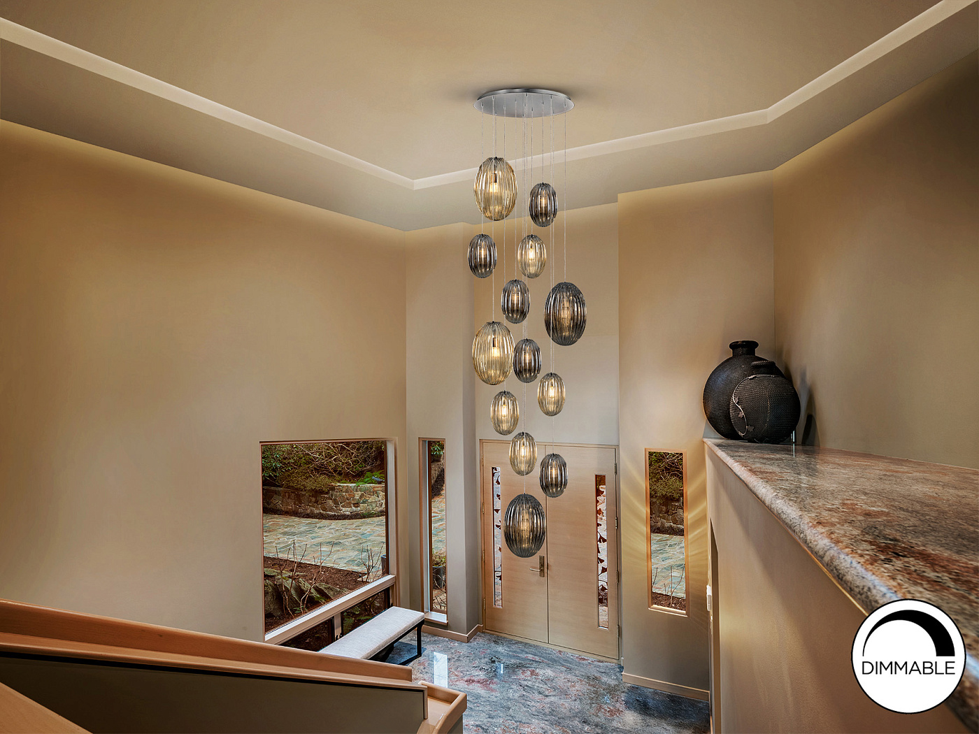Лампа на 13 ламп, металл, хромированная отделка. Комбинированные стеклянные плафоны: маленький и большой размер. Два цвета мерцающего стекла: коньячный и дымчато-серый. Регулируемая длина до 500 см. ·В комплект поставки входят 13 светодиодов E27 мощностью 8 Вт. РЕГУЛИРУЕМАЯ ЯРКОСТЬ. Эта лампа оснащена ГРАВИТАЦИОННЫМИ ПЕРЕКЛЮЧАТЕЛЯМИ для улучшения фиксации на потолке.