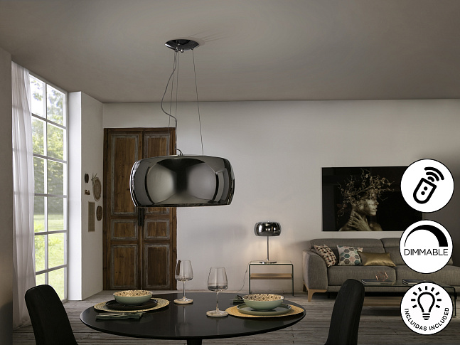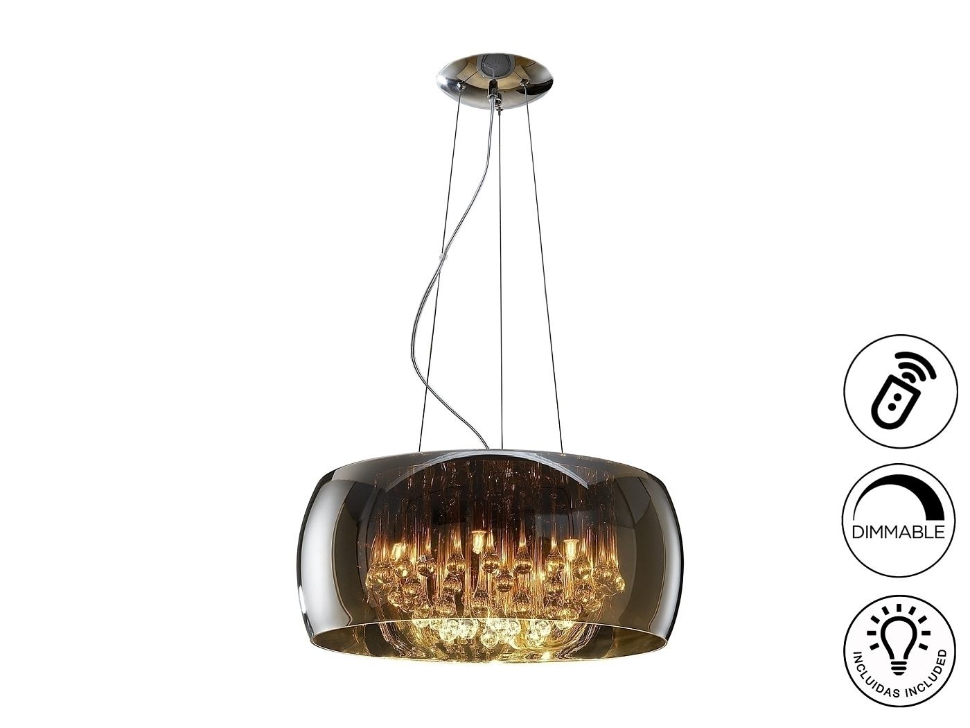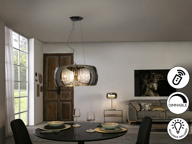 Подвесной светильник из металла с покрытием "хром", плафон из зеркального стекла с подвесками внутри из стекла подобного муранскому, Димируемый. Этот продукт включает в себя диммер приемника и радиочастотный пульт дистанционного управления. · Включает 6 светодиодов G9 мощностью 4,5 Вт.